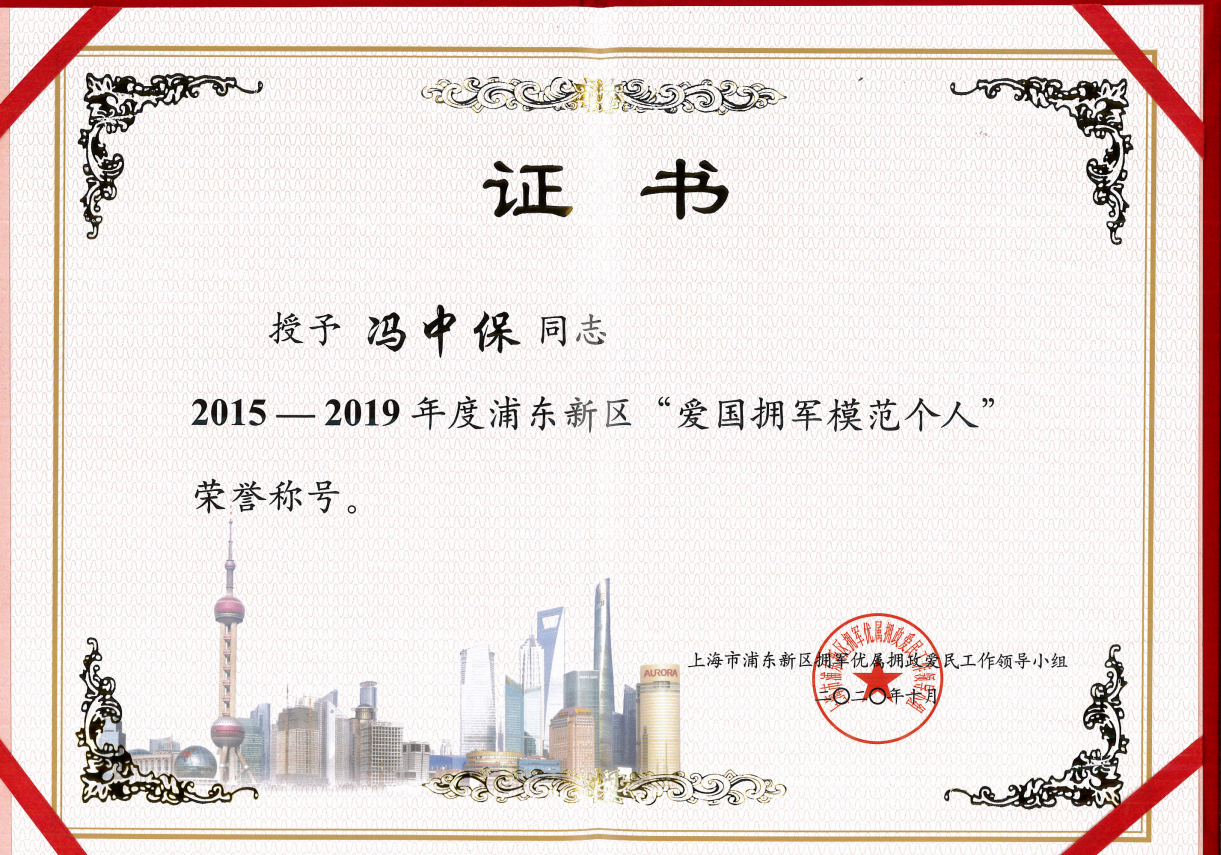 市委常委、浦東新區(qū)區(qū)委書記翁祖亮和上海警備區(qū)副政委周夕根少將出席大會(huì),共同為浦東“全國雙擁模范城”五連冠獎(jiǎng)牌揭牌。宗保公司被評為2015-2019上海市愛國擁軍模范單位、2015-2019浦東新區(qū)愛國擁軍模范單位,公司創(chuàng)始人馮中保被授予2015-2019年度浦東新區(qū)“愛國擁軍模范個(gè)人”榮譽(yù)稱號(hào)。