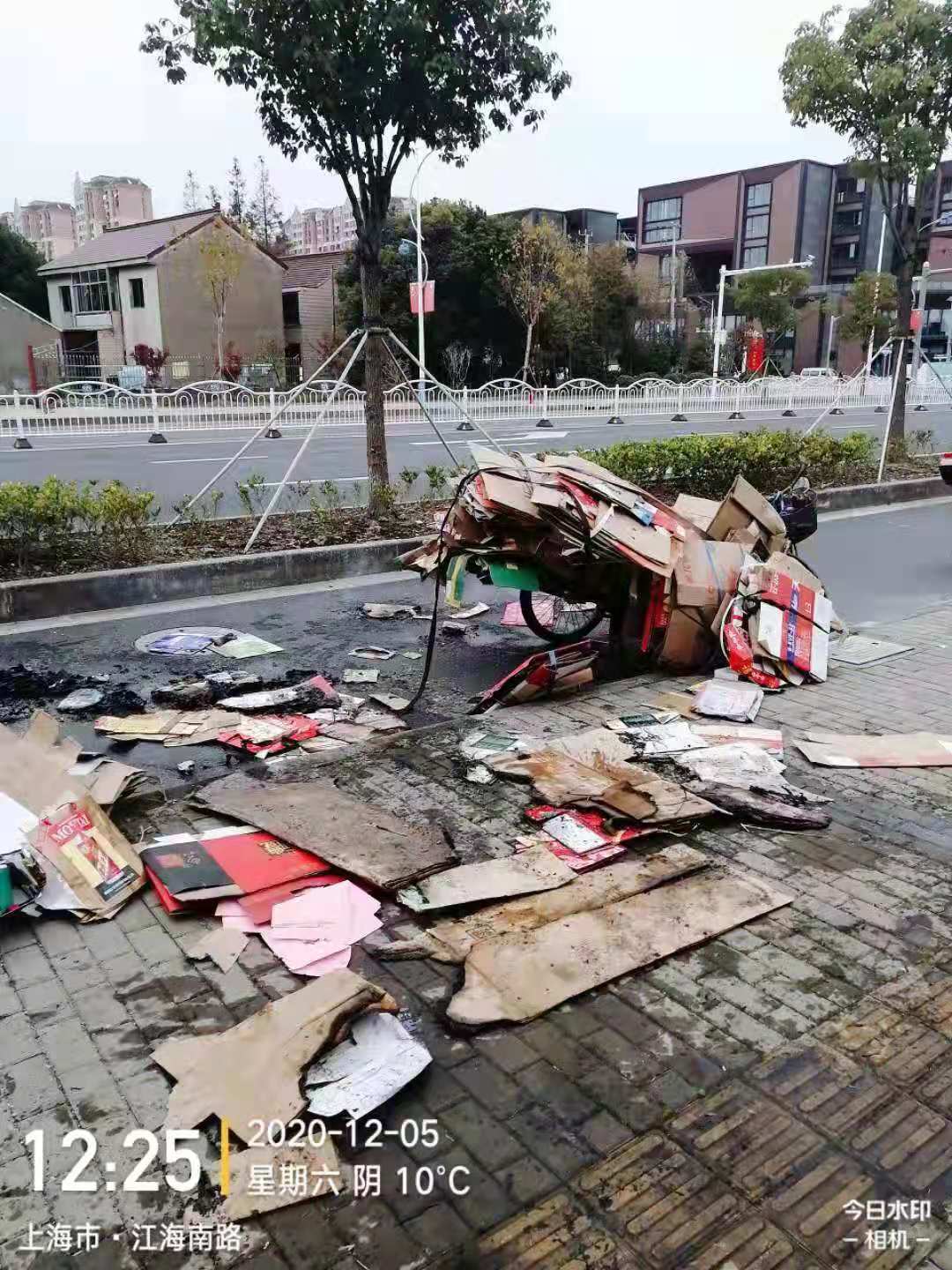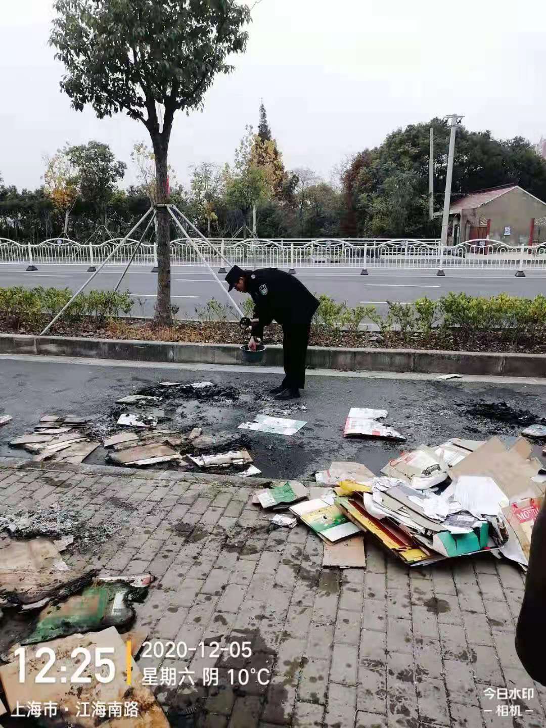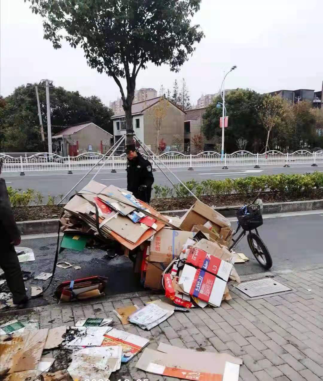 經(jīng)過10多分鐘的努力,火被澆滅。隨后,兩人又幫助老人將廢品紙板整理好裝上車,并從城運中心借掃把把路面殘渣清掃干凈。