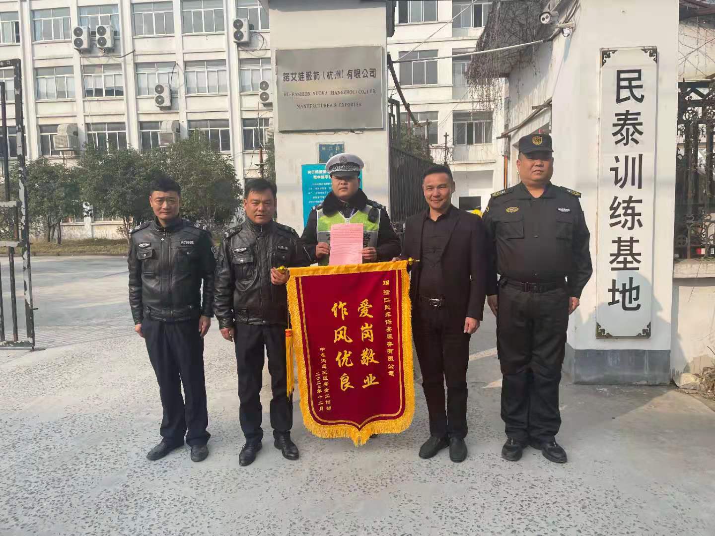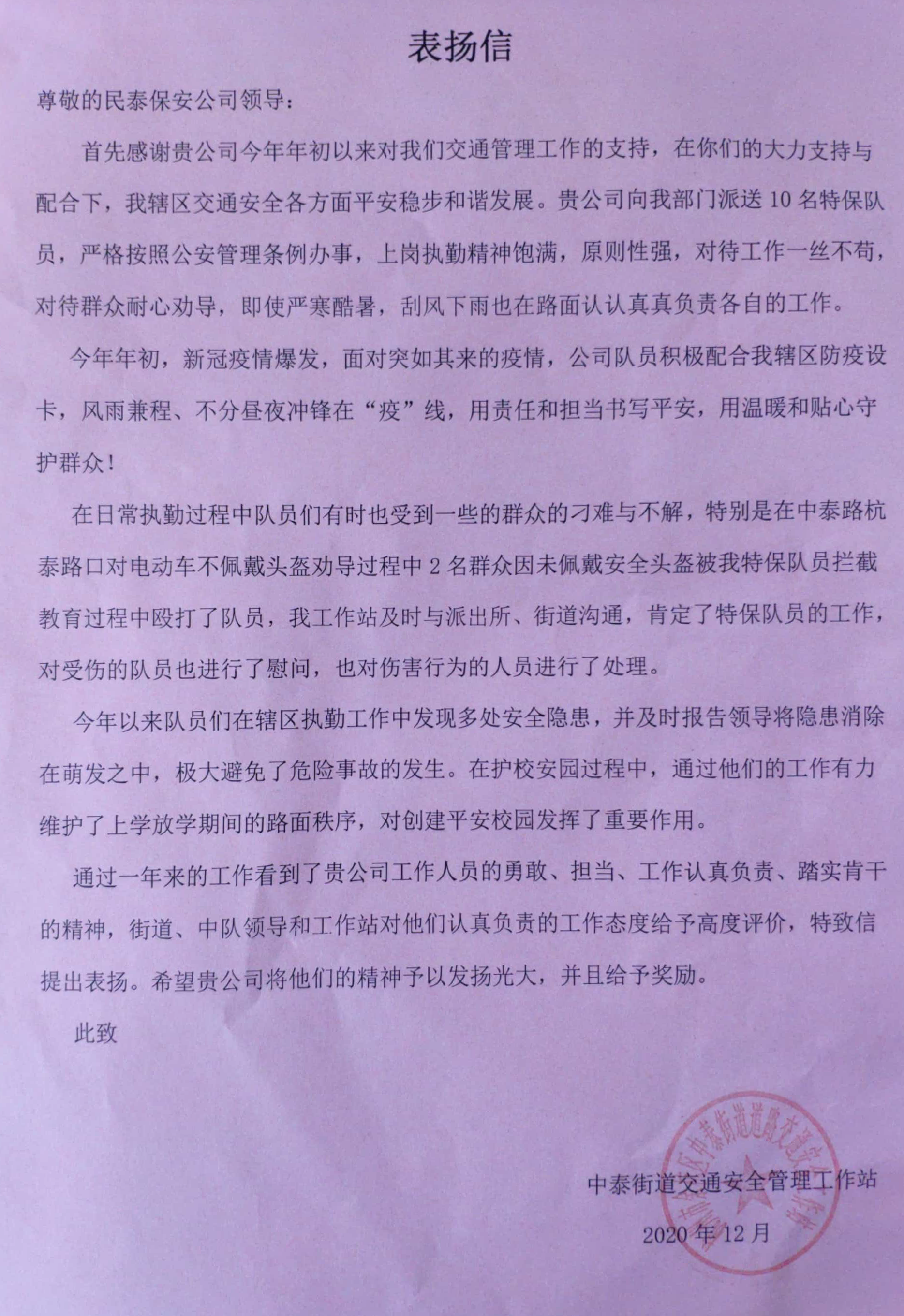 12月28日,中泰街道交通安全管理工作站站長王平將一面繡有“愛崗敬業(yè) 作風(fēng)優(yōu)良”的錦旗和一封表揚(yáng)信送到民泰公司基地,對民泰隊(duì)員盡職盡責(zé)的工作表現(xiàn)提出表揚(yáng)。