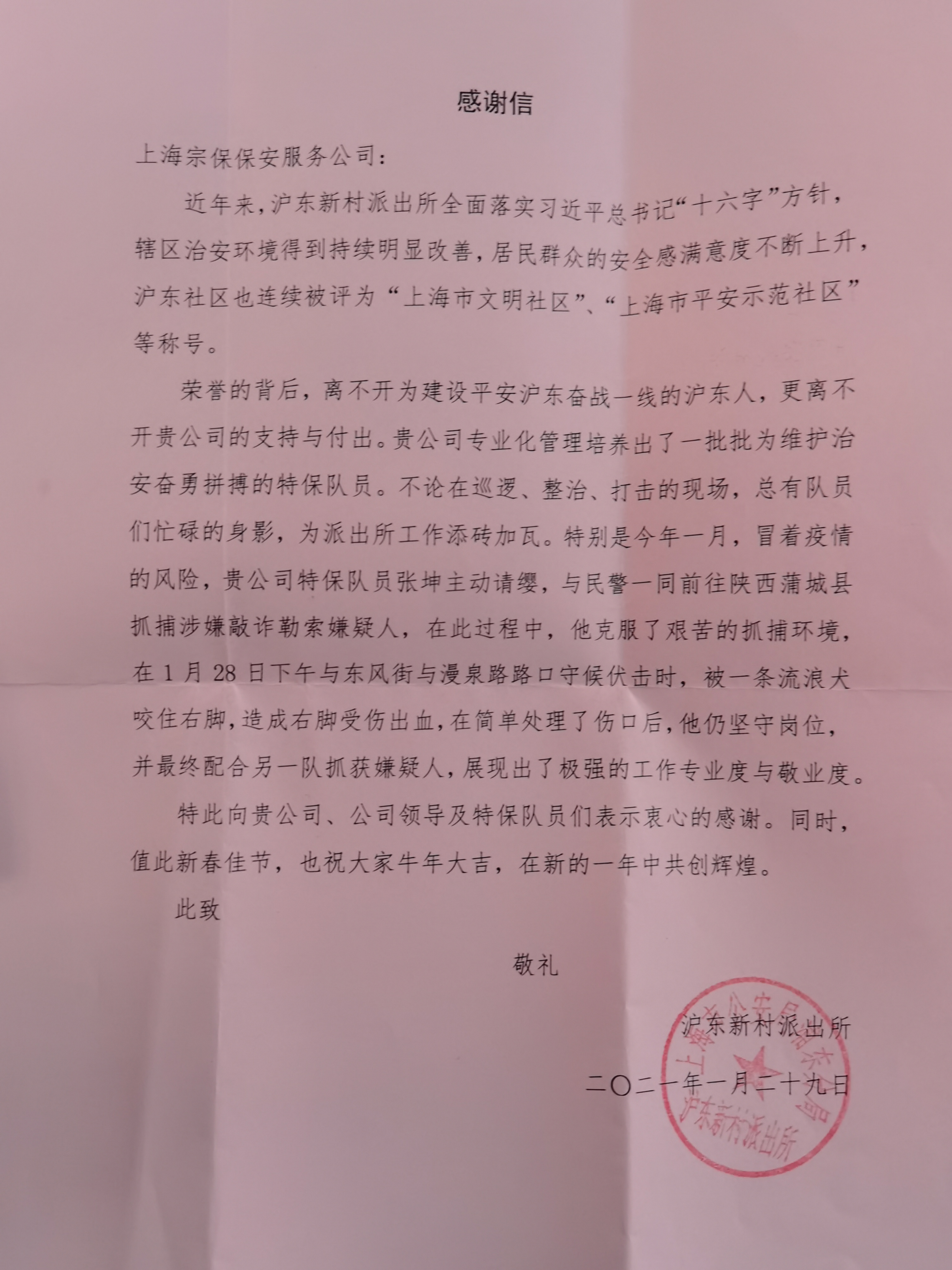 1月29日,宗保公司駐滬東輔警項(xiàng)目收到滬東新村派出所所長(zhǎng)李臻峰送來(lái)的一封感謝信,信中對(duì)公司全力支持和配合派出所的工作表示感謝,對(duì)宗保隊(duì)員張坤提出了特別表?yè)P(yáng)。