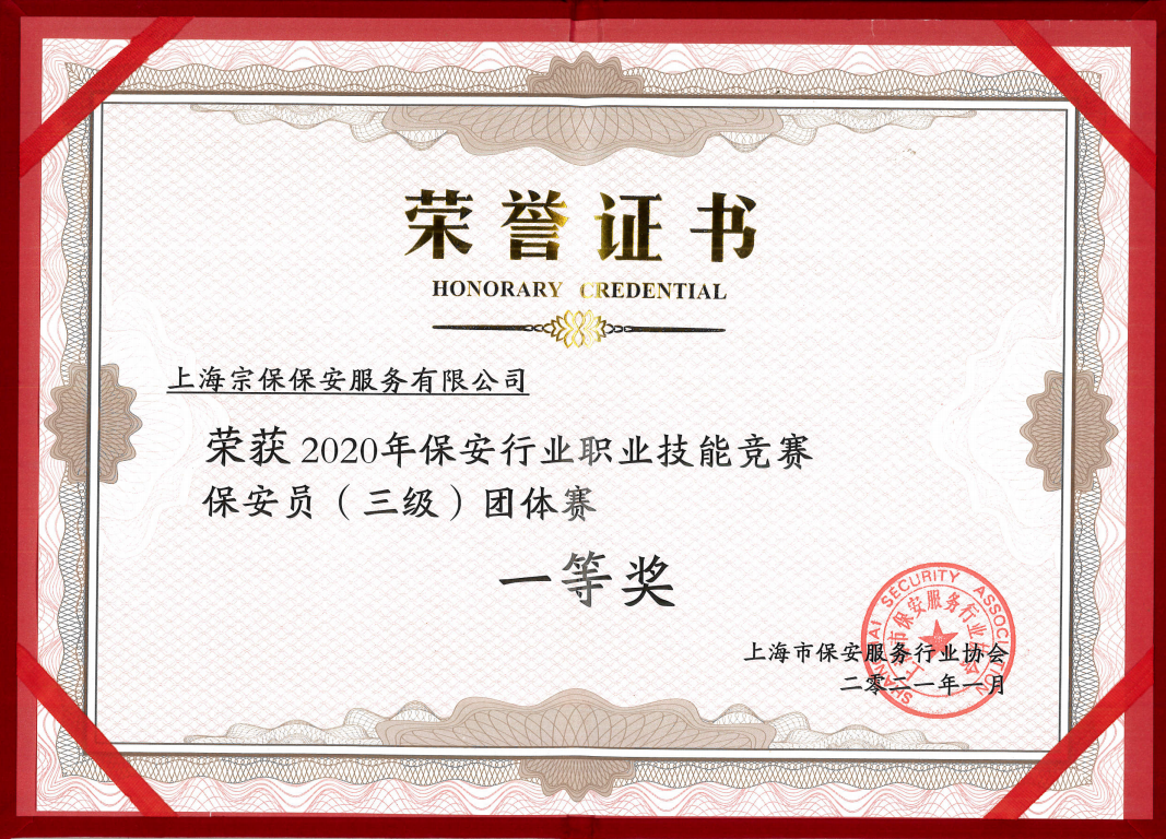 2月3日,上海市保安服務(wù)行業(yè)協(xié)會(huì)在前期公開、公正、公平競(jìng)賽的基礎(chǔ)上,決定對(duì)取得競(jìng)賽優(yōu)異成績(jī)的25個(gè)參賽團(tuán)體進(jìn)行表彰。上海宗保保安服務(wù)有限公司榮獲“2020年保安行業(yè)職業(yè)技能競(jìng)賽保安員(三級(jí))團(tuán)體賽”一等獎(jiǎng)。