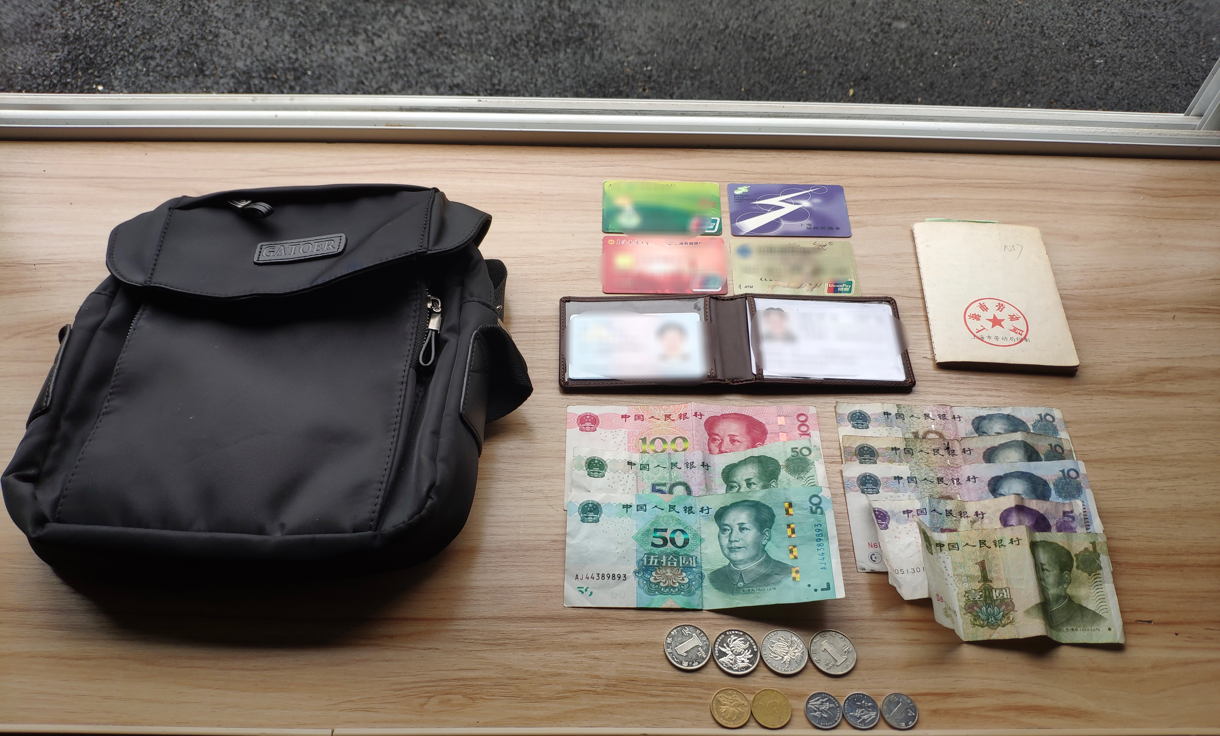 當(dāng)天21:00,許萌、劉明珠在濱江大道巡邏時(shí),發(fā)現(xiàn)人行道旁一輛共享單車(chē)上遺留一個(gè)黑色公文包,包內(nèi)有200多元現(xiàn)金、1張身份證、3張銀行卡和1張公交卡等物品,組長(zhǎng)許萌當(dāng)即用對(duì)講機(jī)向陸家嘴治安派出所指揮中心報(bào)告。
