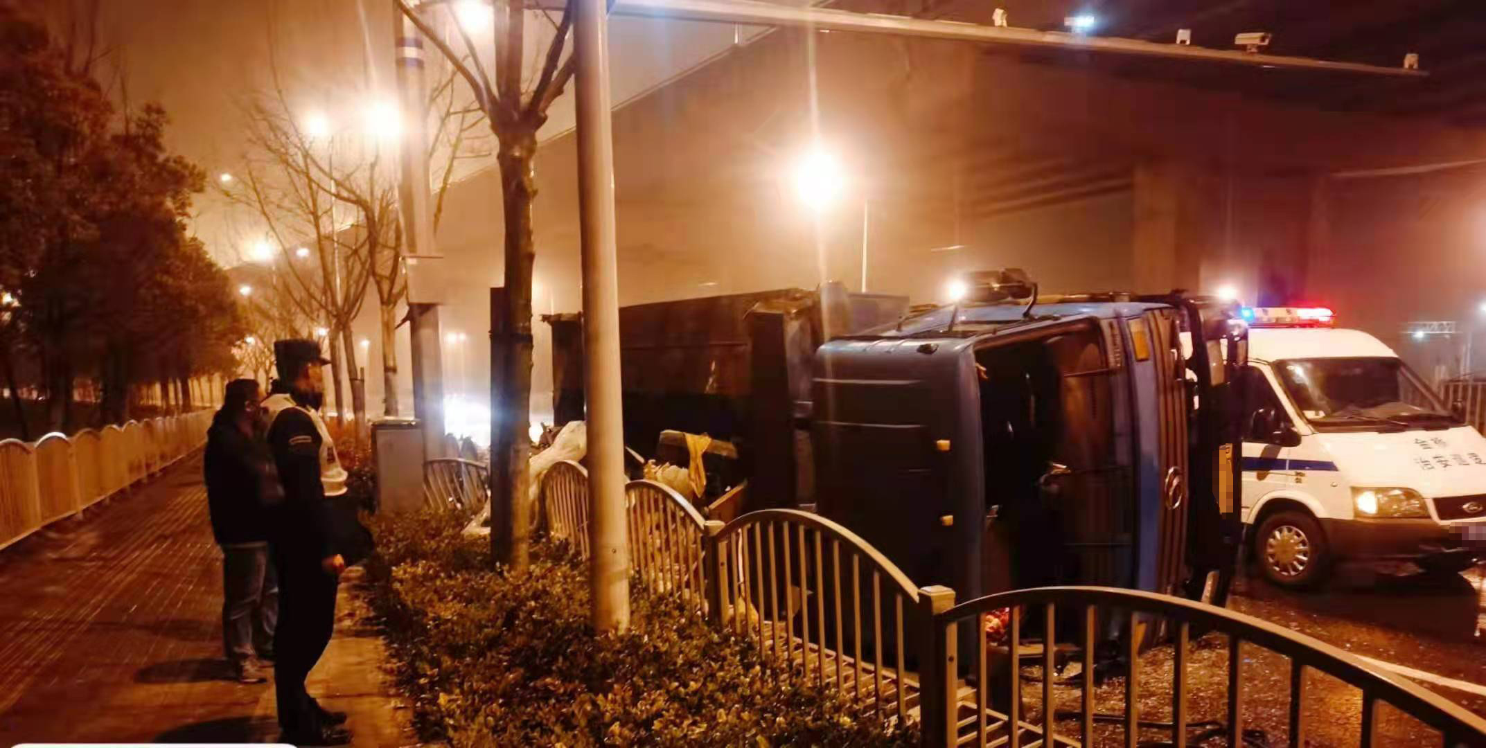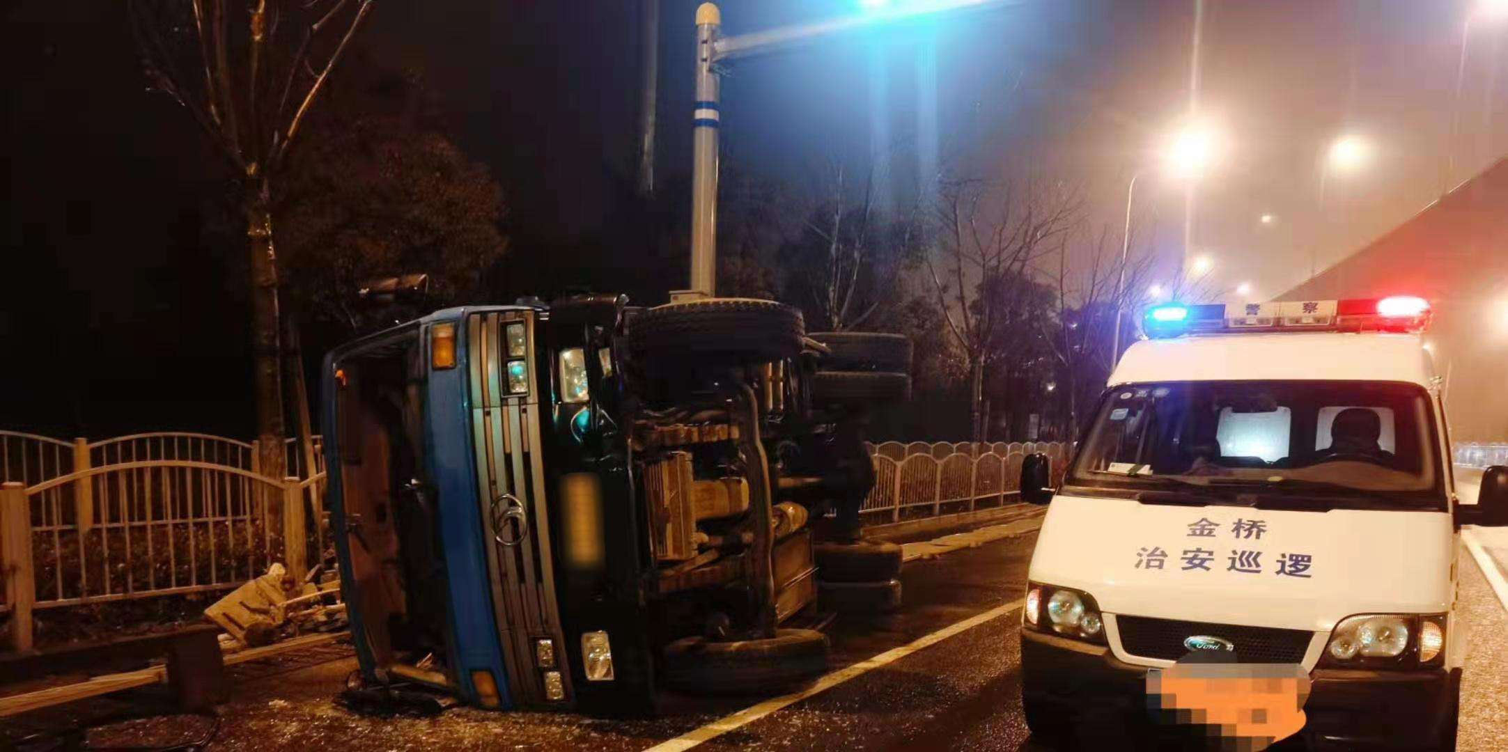 當(dāng)天凌晨1:00左右,金橋派出所值班室接到路人報(bào)警,稱在申江路云順路有一輛拉滿渣土的貨車(chē)因?yàn)橛晏炻坊?chē)速過(guò)快發(fā)生了側(cè)翻。