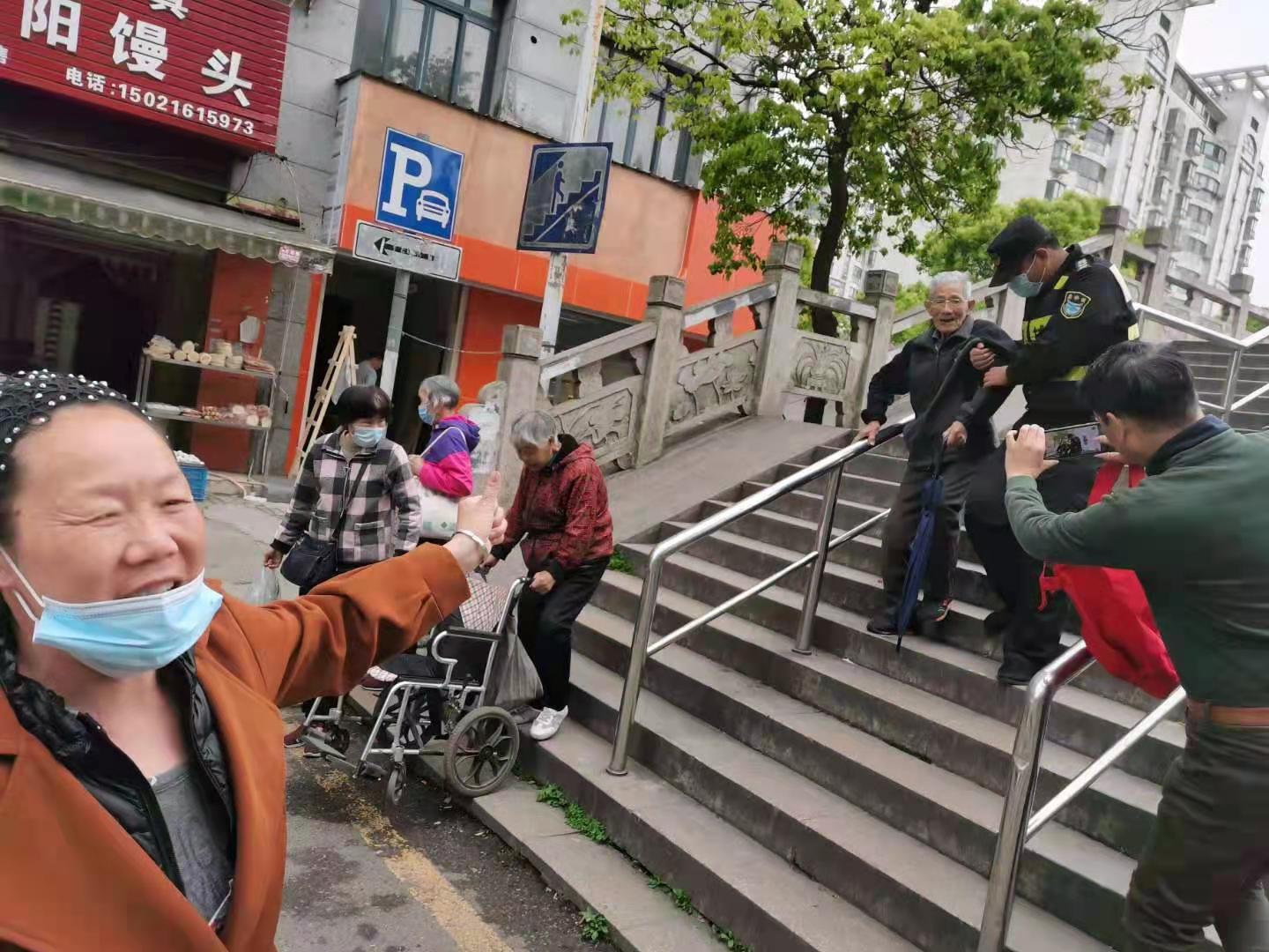 4月23日,宗保公司駐周浦市容項目隊員王楷迪,攙扶老人過天橋。