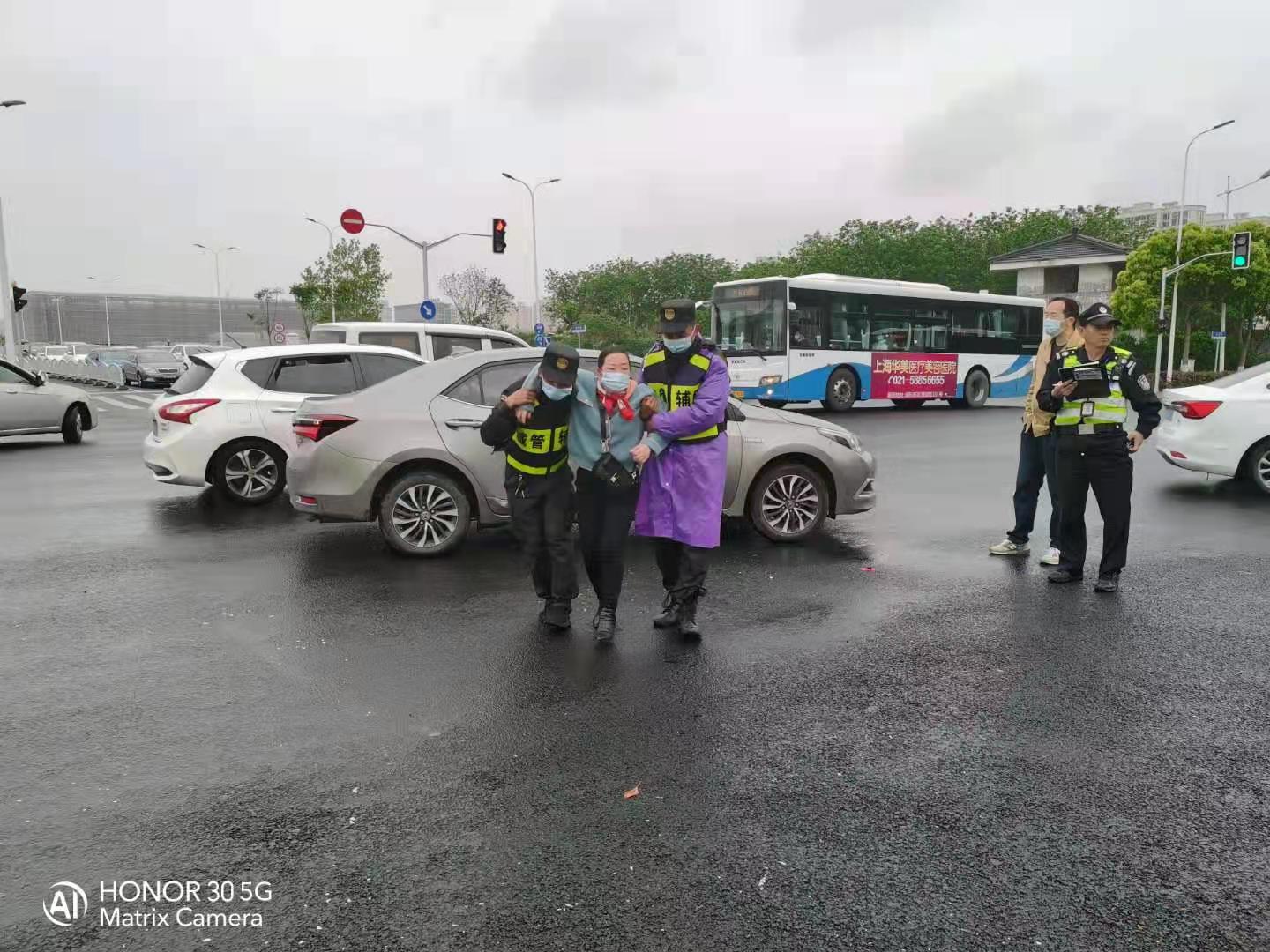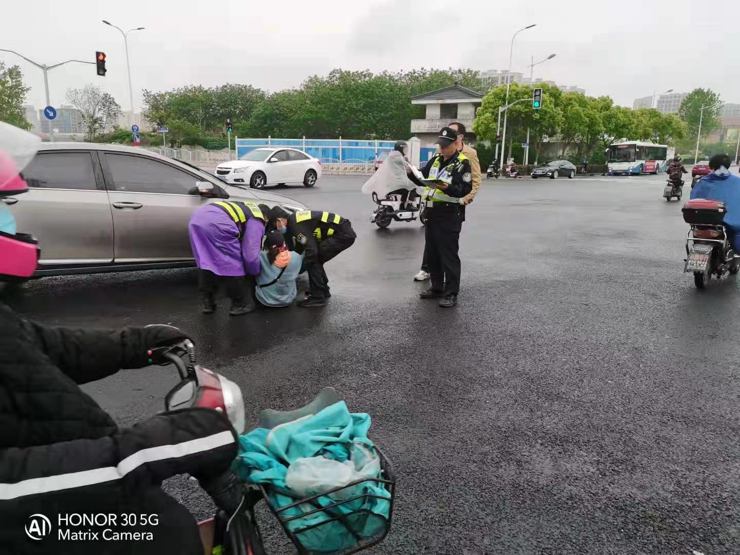 當天8:02,彭勇、李來者在周園路繁榮東路路口巡邏時,在路口遇到一起交通事故,一輛小汽車將一輛電動車撞翻,一女子倒在路口中央,車主被嚇得站在一旁不知所措。兩人趕緊上前詢問傷者情況,被告知暫無大礙后,便扶其到路邊安全地帶。