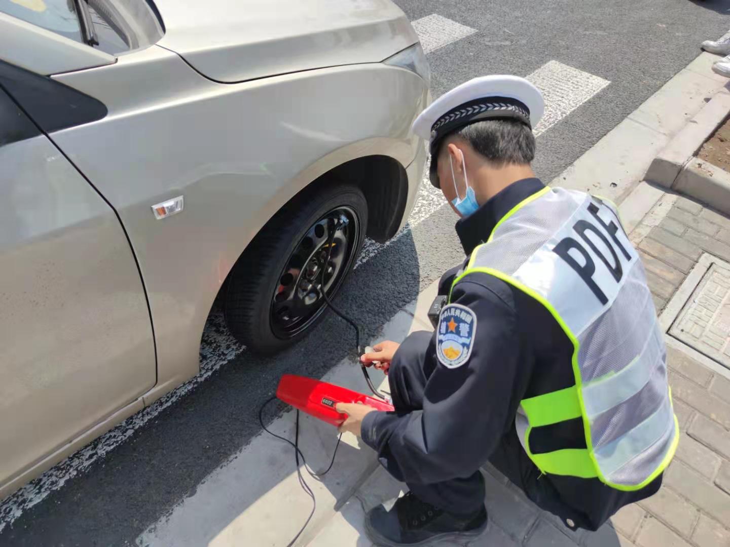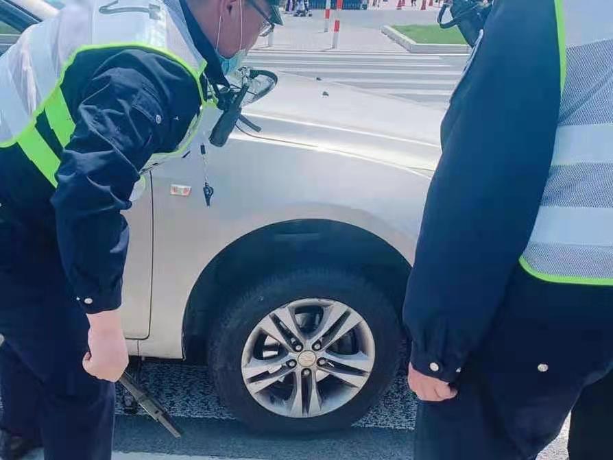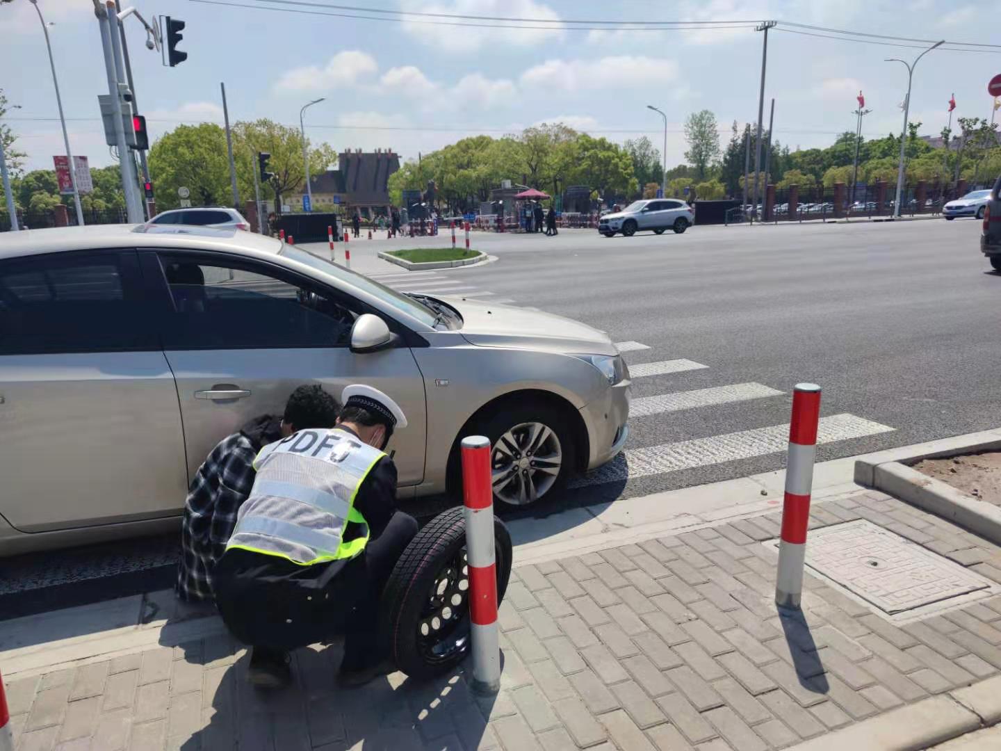當(dāng)日10:15,一位女士駕駛汽車行駛至動物園2號門時,車輛右前輪突然爆胎,打著雙閃燈停在斑馬線上,路口當(dāng)值交管輔警王志文和候歡發(fā)現(xiàn)后,立即上前詢問。