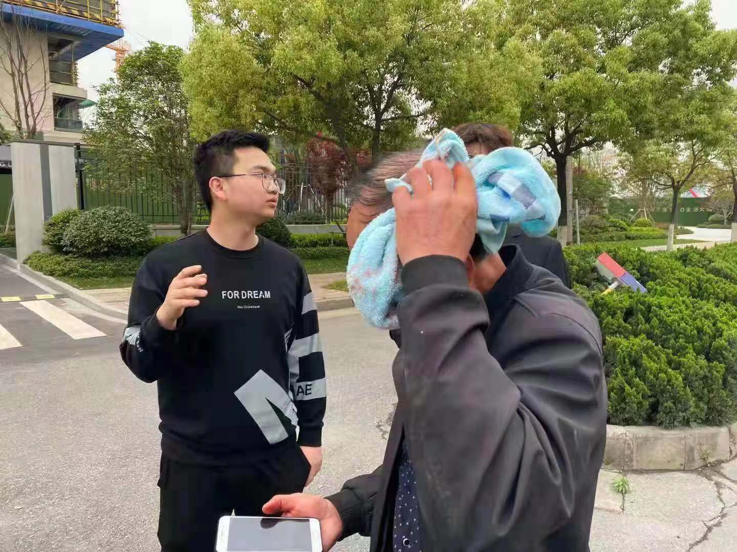 4月27日,浙江民泰公司駐星橋交管項(xiàng)目隊(duì)員勸說頭部受傷老人前往醫(yī)院就醫(yī)。