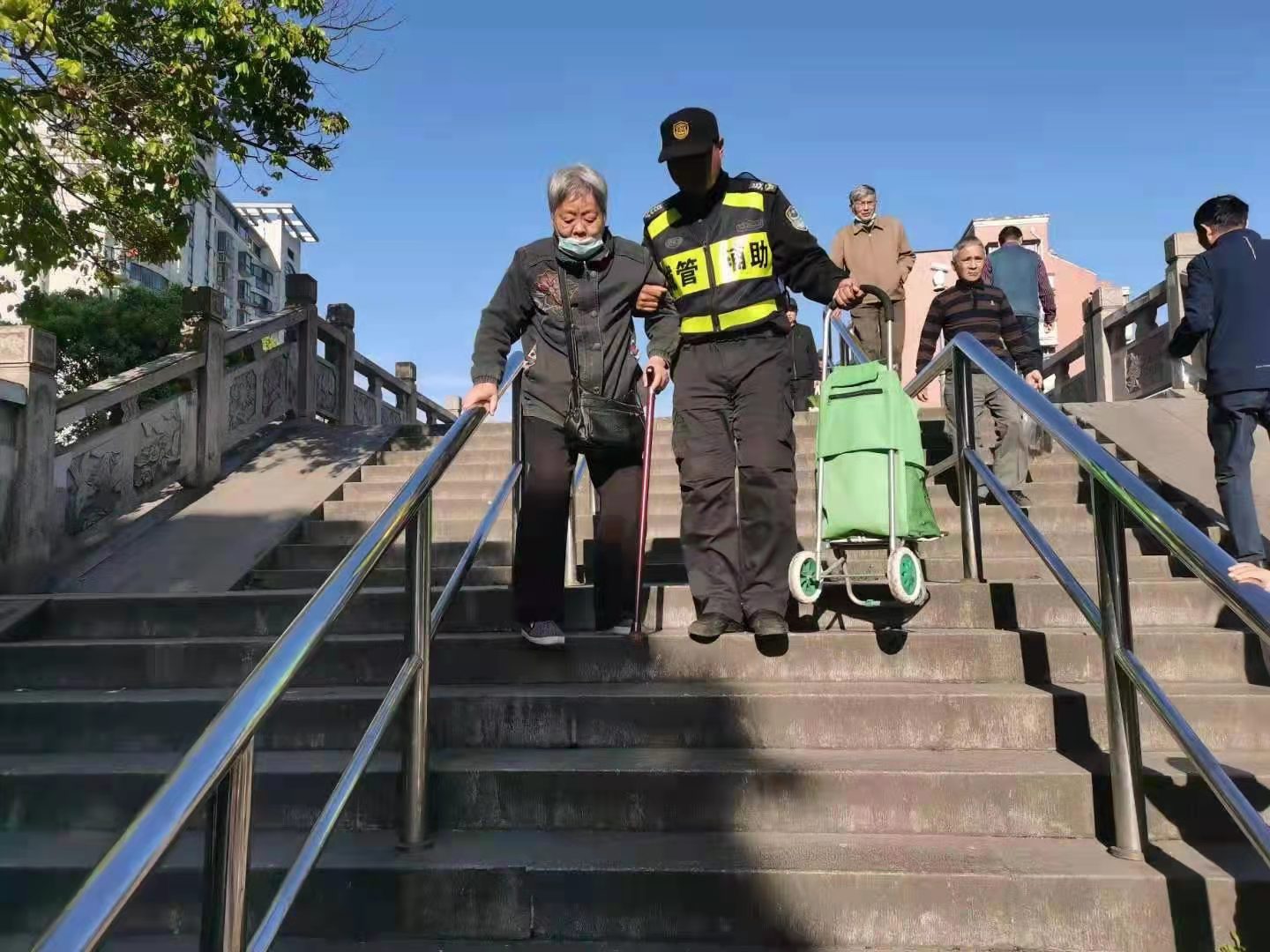 4月26日,宗保公司駐周浦市容項(xiàng)目隊(duì)員攙扶老奶奶過天橋。