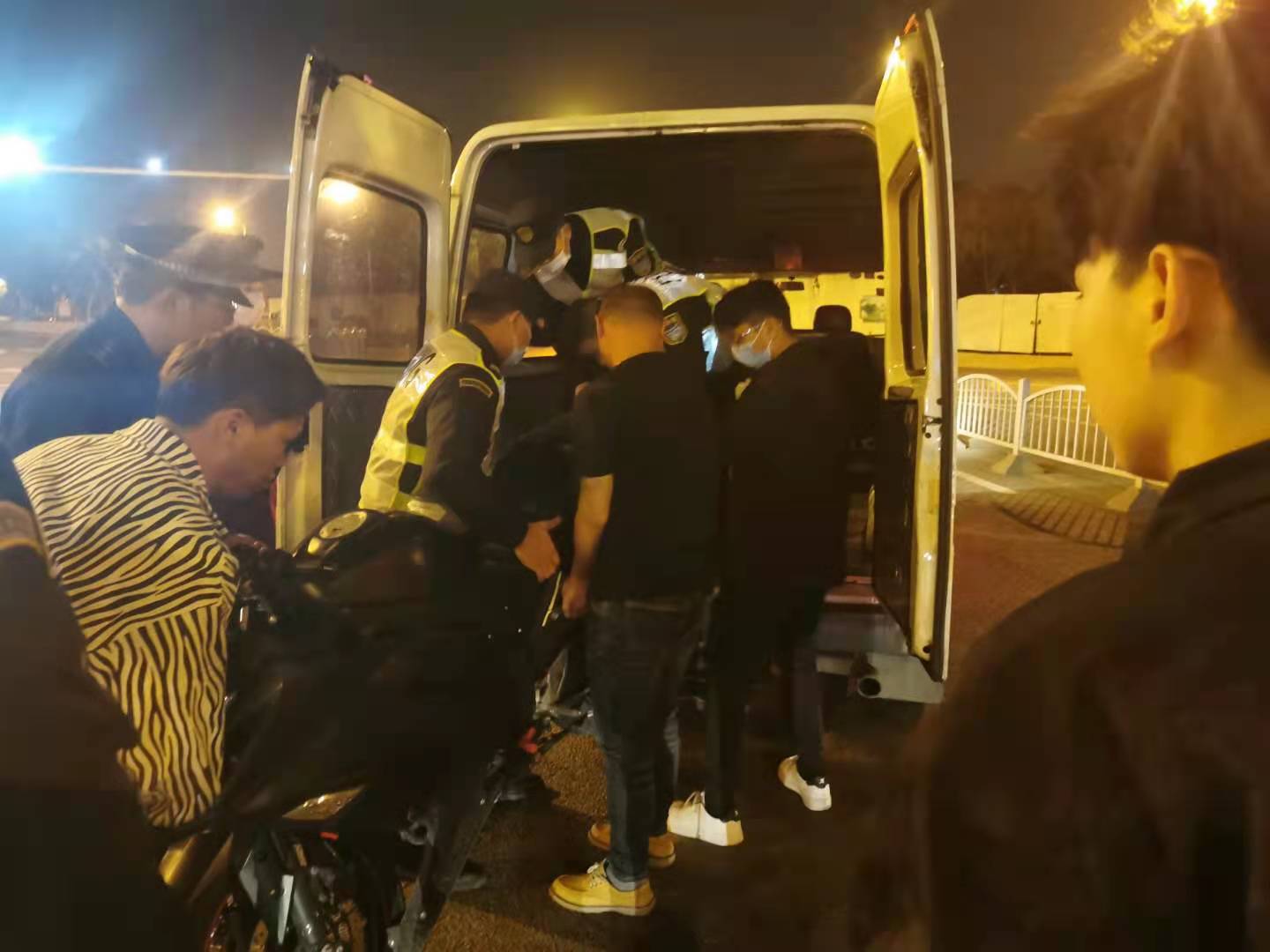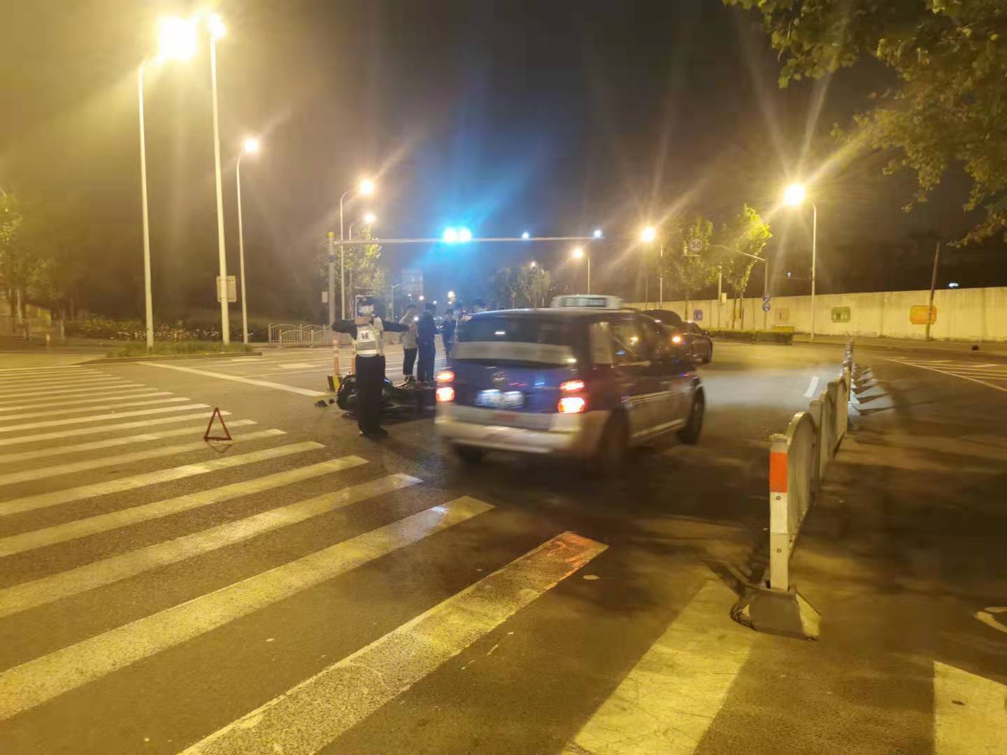 當(dāng)天23:30,駐金橋派出所夜班巡邏隊(duì)員張港、賴作利巡邏至錦繡東路近金橋路時(shí),發(fā)現(xiàn)前方路口發(fā)生交通事故,便立即上前查看,一摩托車駕駛員由于拐彎速度過快與對向正在行駛的一輛轎車相撞。