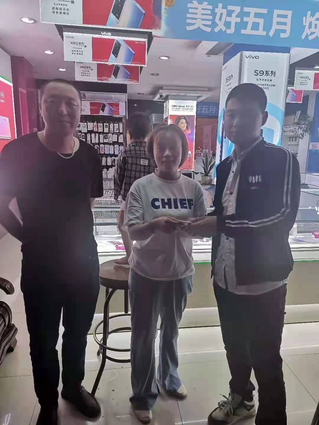 30多分鐘過(guò)去了,仍未見(jiàn)失主前來(lái)尋找。正當(dāng)兩人準(zhǔn)備將手機(jī)交到派出所時(shí),一女子打來(lái)電話說(shuō)自己是失主,是附近vivo手機(jī)店的店主,但因店里無(wú)人看店,暫時(shí)無(wú)法走開(kāi)。得知這一情況,兩人便主動(dòng)提出可以將手機(jī)送過(guò)去。