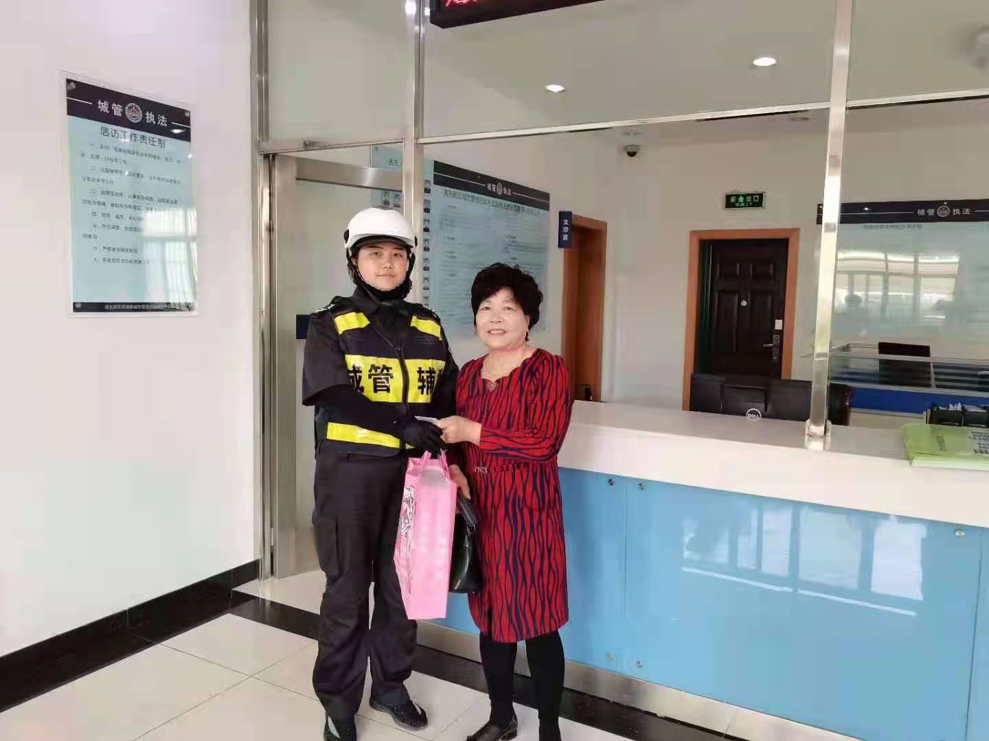 16:05左右,一位阿姨急匆匆趕來(lái),好像是在尋找什么。曹秋霞見(jiàn)狀,主動(dòng)上前詢問(wèn)是不是丟了東西,阿姨說(shuō)自己丟了一個(gè)手提袋,描述的袋內(nèi)裝的東西和她撿到的東西一模一樣。確認(rèn)阿姨是失主后,曹秋霞將阿姨帶到周浦城管中隊(duì),把手提袋歸還給了阿姨。