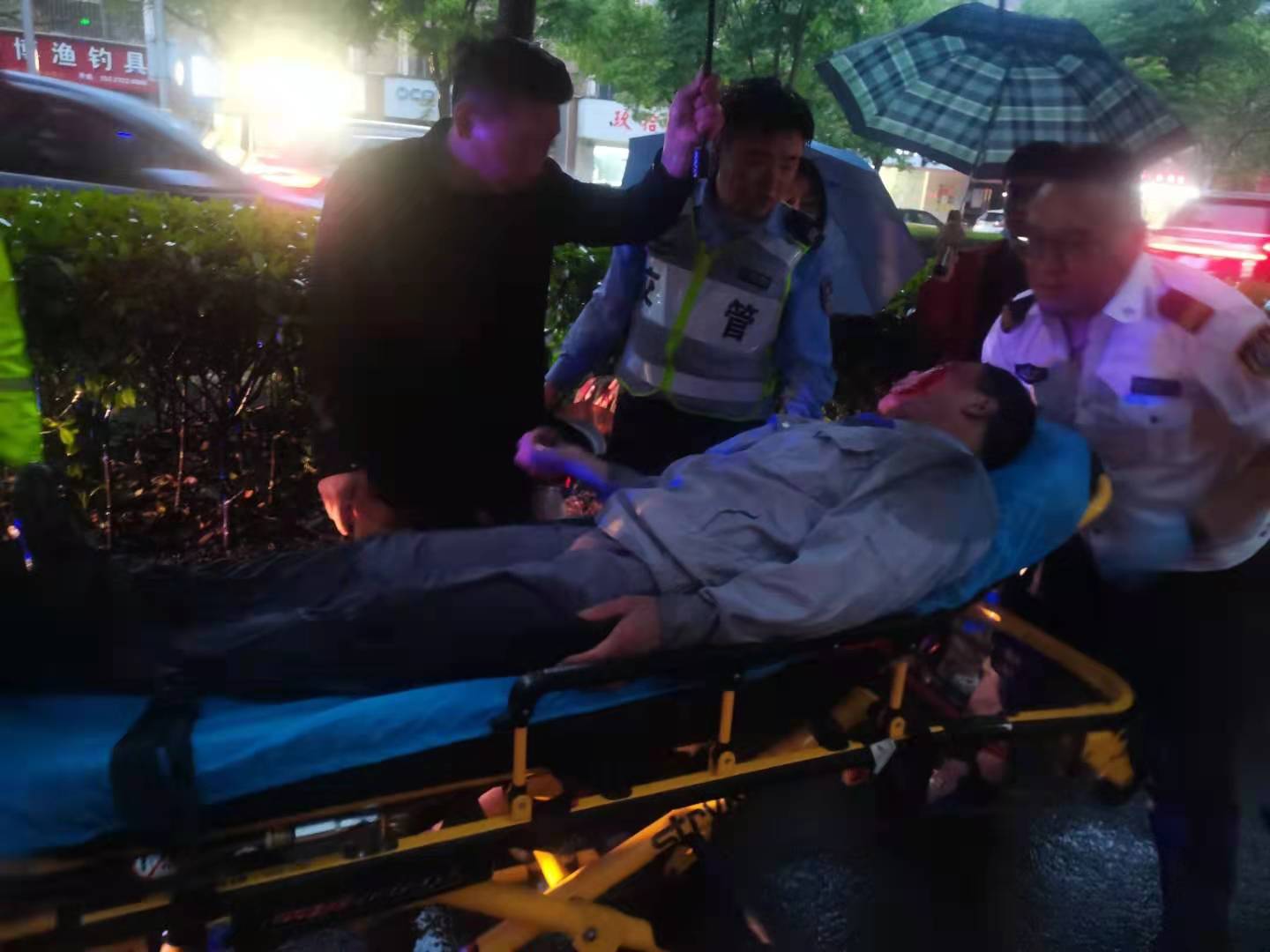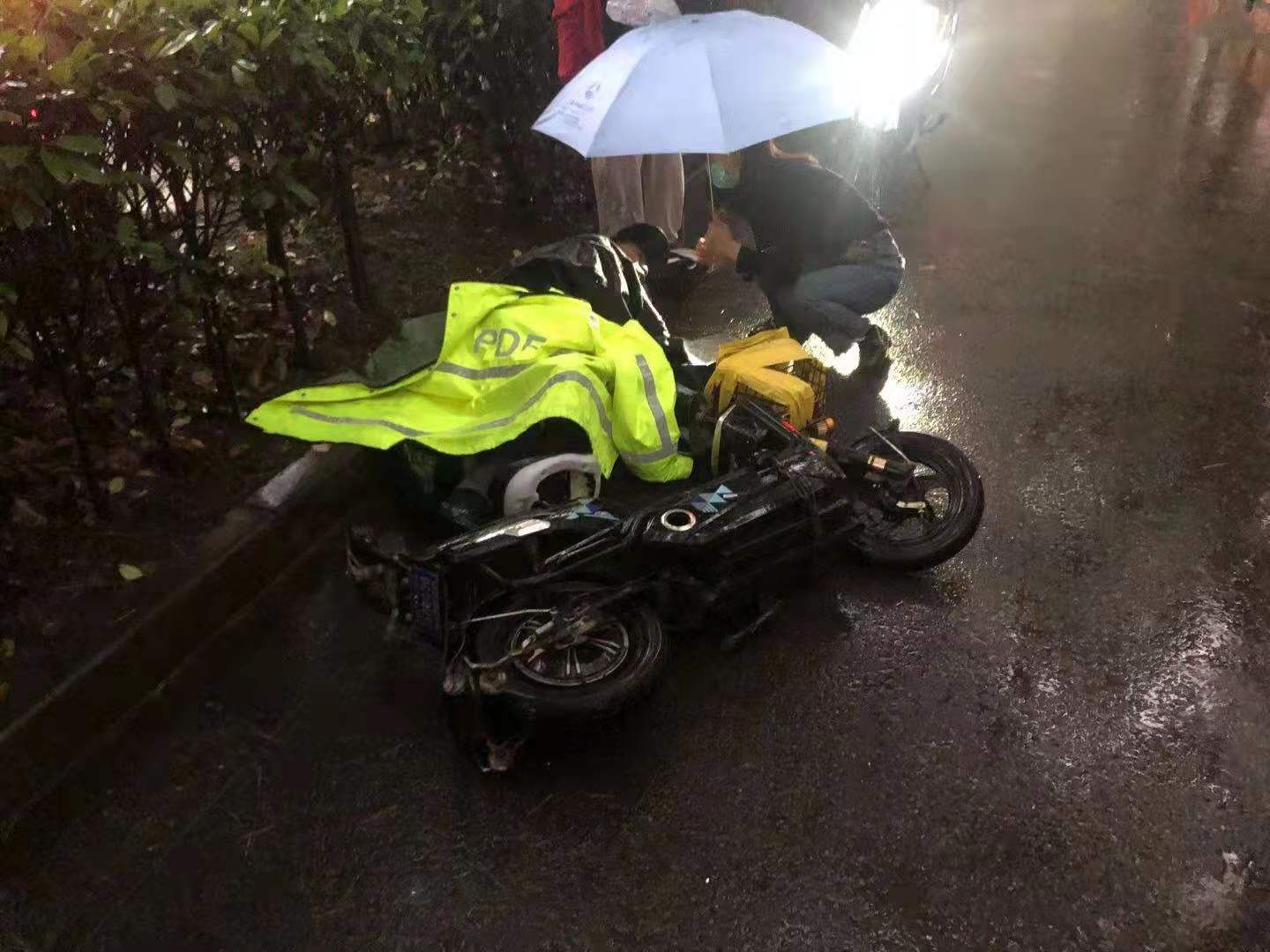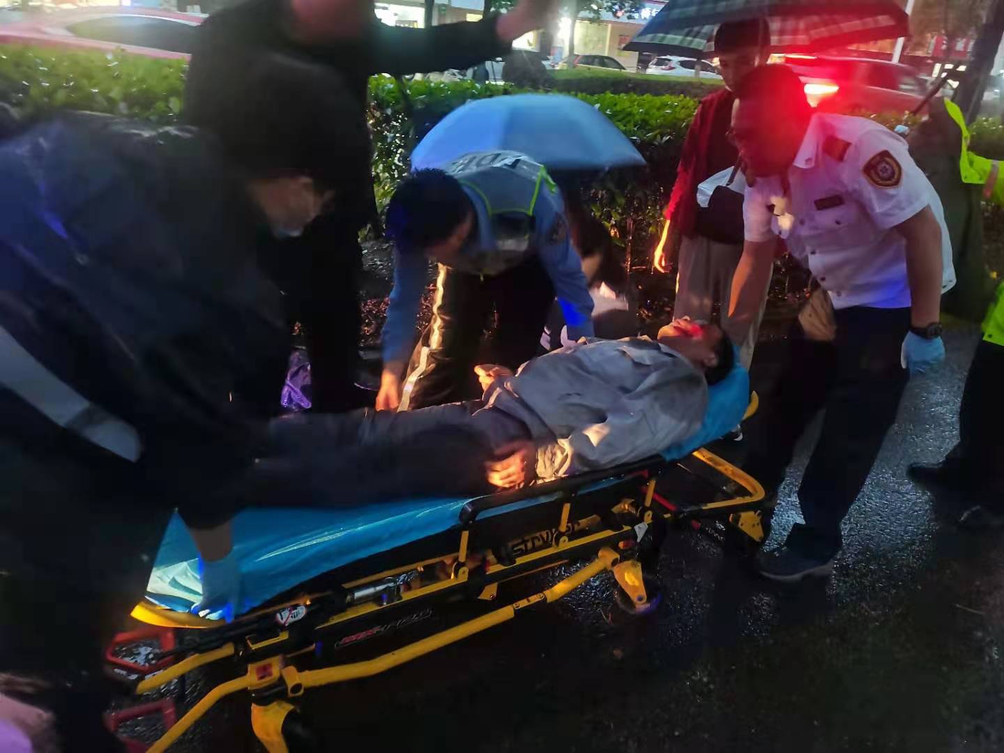 當(dāng)時(shí)天正下著大雨,因擔(dān)心長(zhǎng)時(shí)間淋雨受傷男子會(huì)感冒,細(xì)心的孫義強(qiáng)跑到附近商鋪,借來(lái)雨傘為等待救護(hù)的男子撐傘避雨。同時(shí),為防止二次交通事故傷害,王衛(wèi)強(qiáng)在現(xiàn)場(chǎng)進(jìn)行交通疏導(dǎo)。