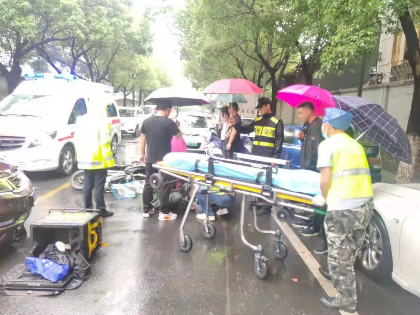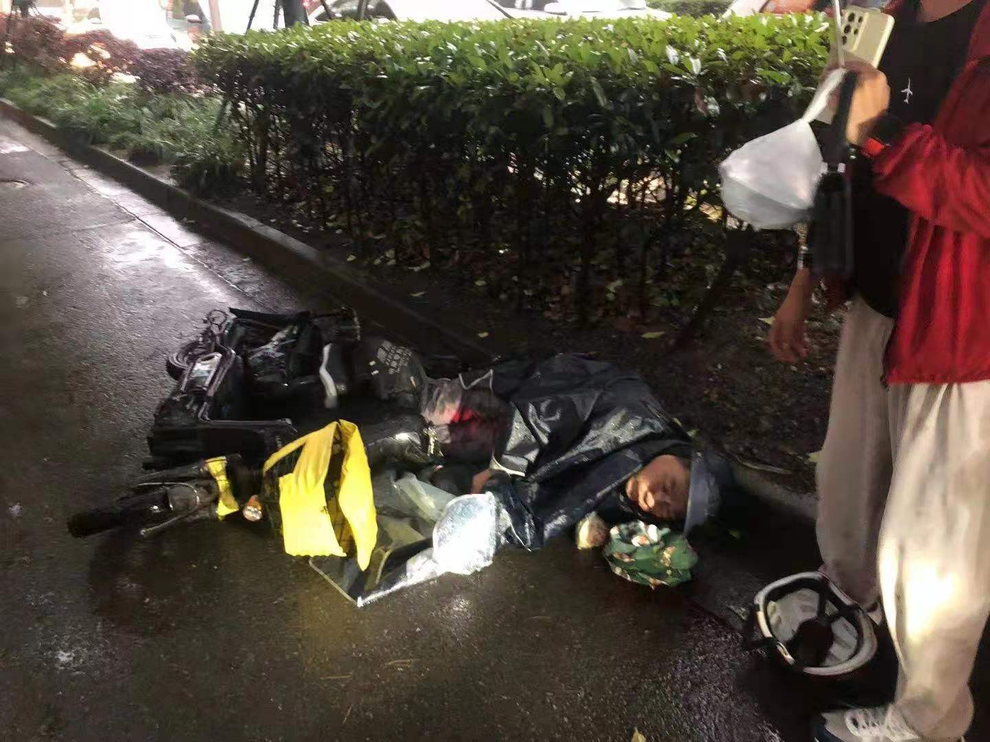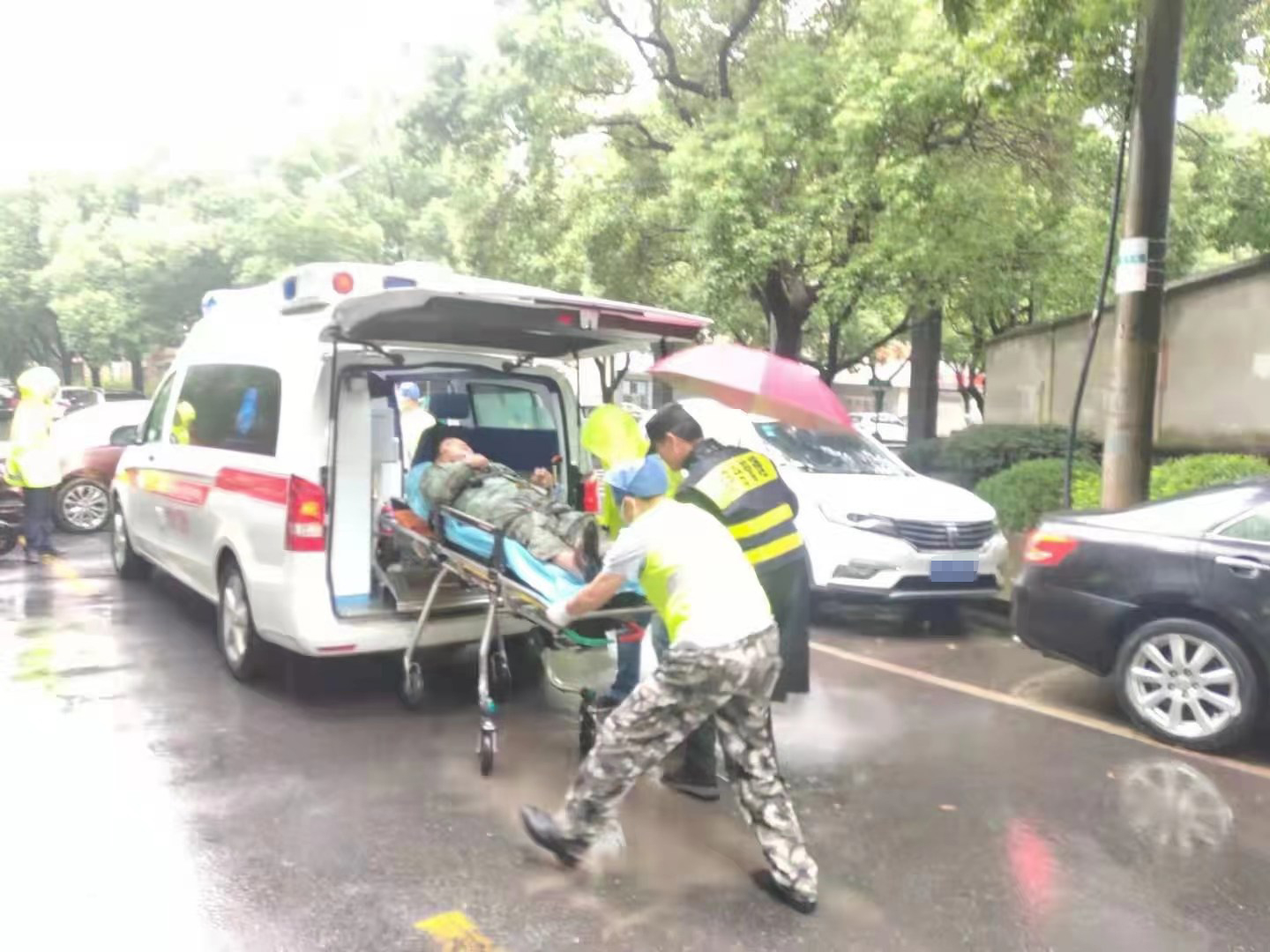 當(dāng)時(shí)天正下著大雨,因擔(dān)心長(zhǎng)時(shí)間淋雨受傷男子會(huì)感冒,細(xì)心的孫義強(qiáng)跑到附近商鋪,借來(lái)雨傘為等待救護(hù)的男子撐傘避雨。同時(shí),為防止二次交通事故傷害,王衛(wèi)強(qiáng)在現(xiàn)場(chǎng)進(jìn)行交通疏導(dǎo)。