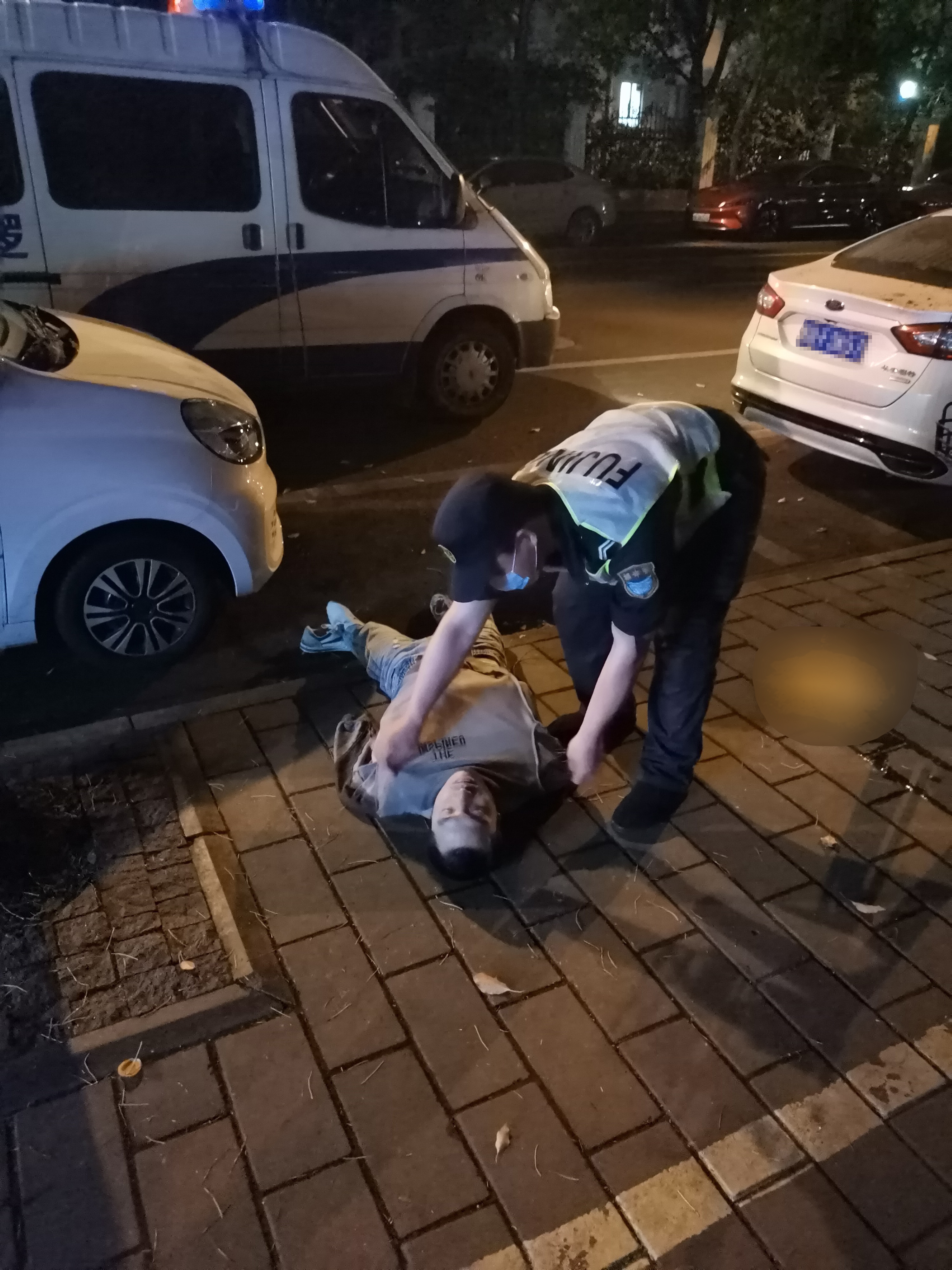 當(dāng)日22:50,楊俊國(guó)、馬世界、朱雙喜駕車(chē)在金藏路靠近楊高中路巡邏時(shí),看到一名男子赤裸上身躺在馬路邊,衣服丟在一旁。
