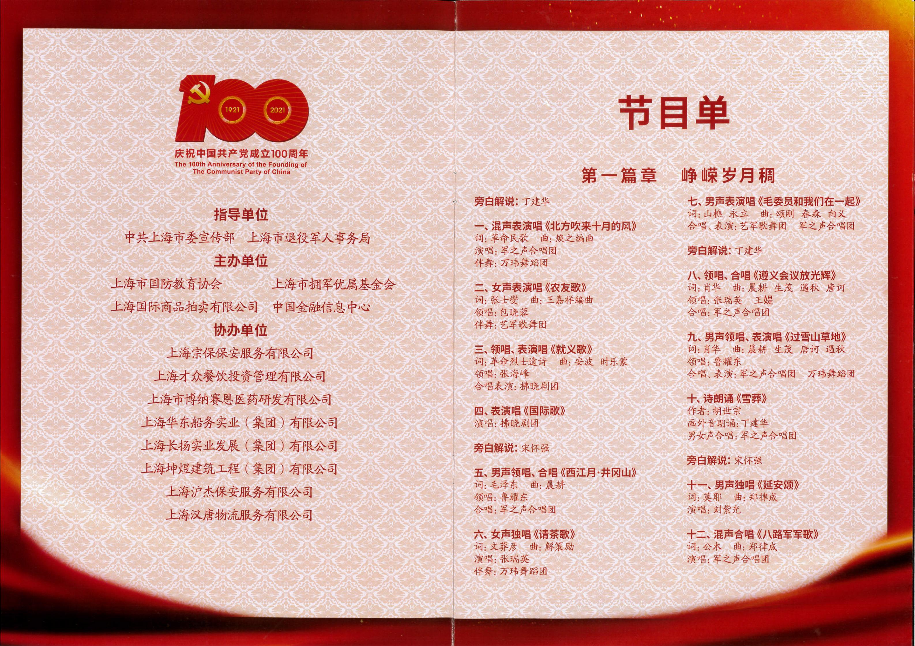 該演出是上海市慶祝中國共產(chǎn)黨成立100周年群眾性系列活動(dòng)之一,由中共上海市委宣傳部、上海市退役軍人事務(wù)局共同指導(dǎo),宗保公司參與贊助。