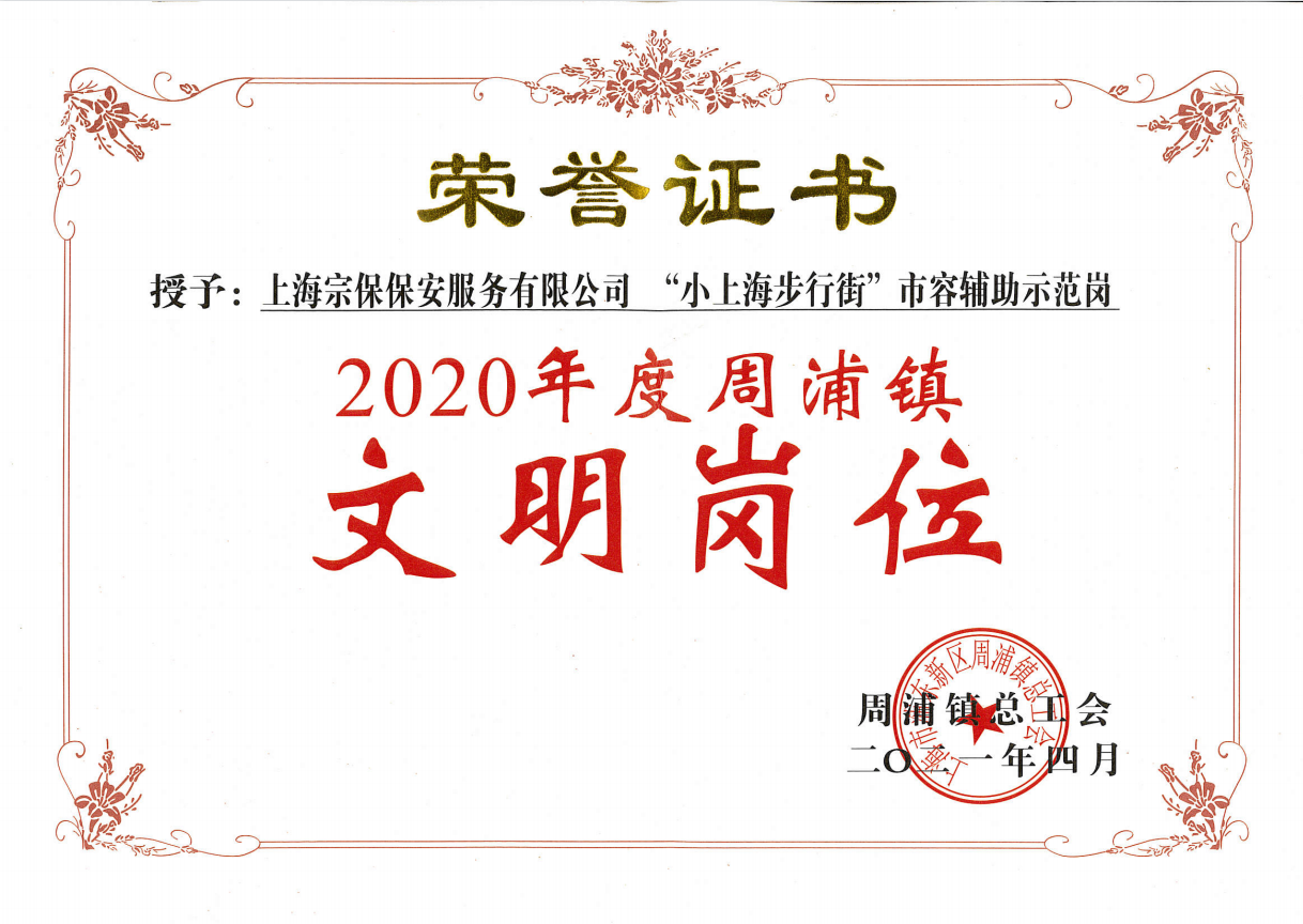 為進(jìn)一步弘揚(yáng)勞模精神、勞動(dòng)精神、工匠精神,近日,周浦鎮(zhèn)總工會(huì)對(duì)一批先進(jìn)集體和先進(jìn)個(gè)人進(jìn)行了表彰。宗保公司“小上海步行街”市容輔助示范崗榮獲周浦鎮(zhèn)文明崗位稱號(hào)。