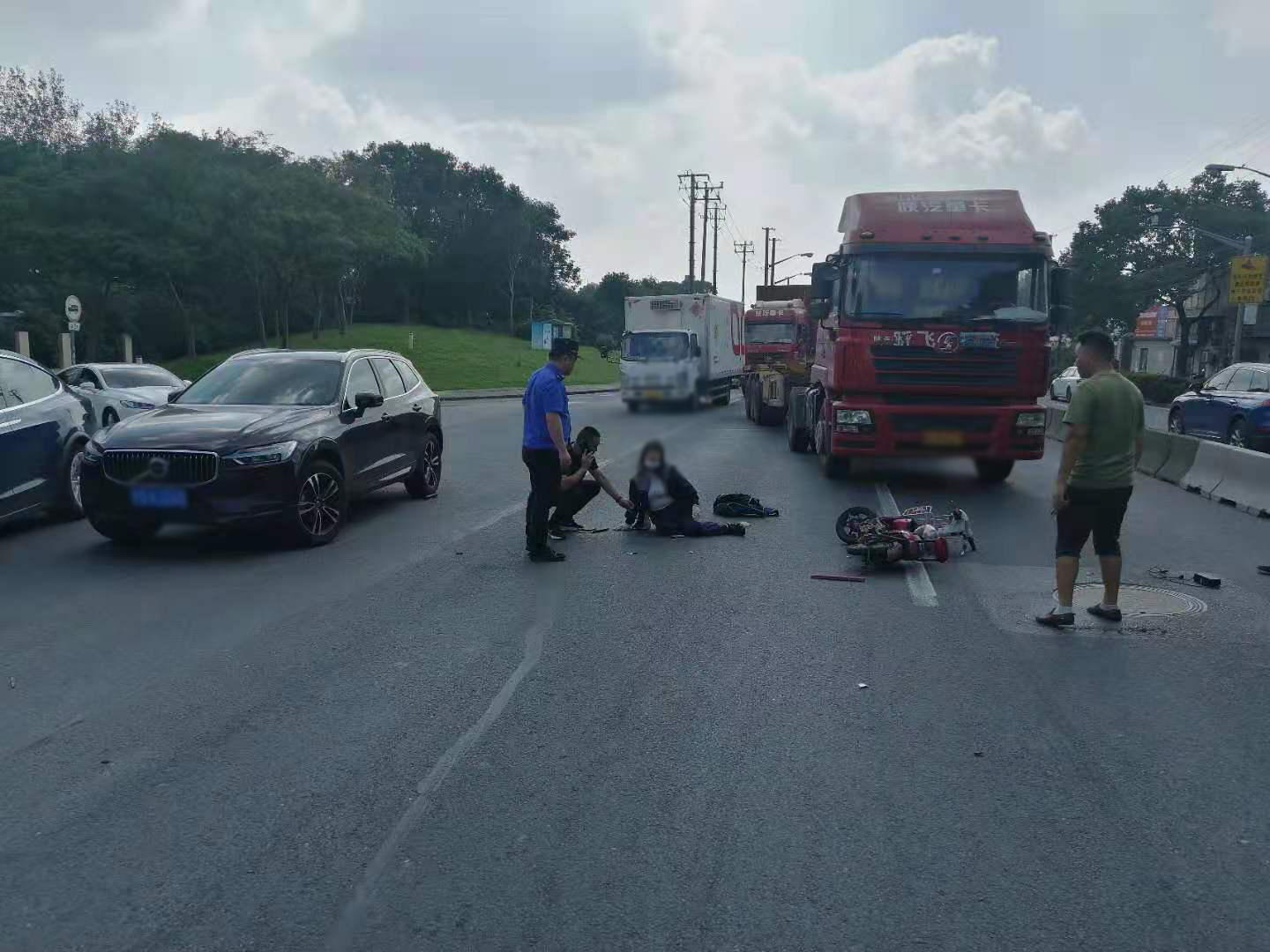 當(dāng)日10:00,陳睿、李旭龍、路標(biāo)、秦金奎在城管中隊(duì)執(zhí)法員益衛(wèi)華的帶領(lǐng)下,驅(qū)車在高橋鎮(zhèn)浦東北路高荷路路口巡邏時(shí),遇到一起交通事故,一輛集卡車與一輛電瓶車相撞,騎電瓶車女子癱坐在地上。