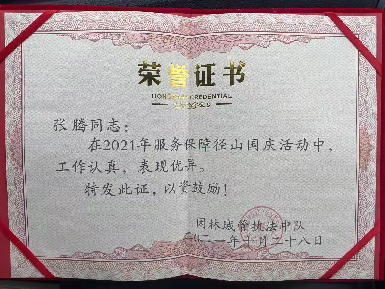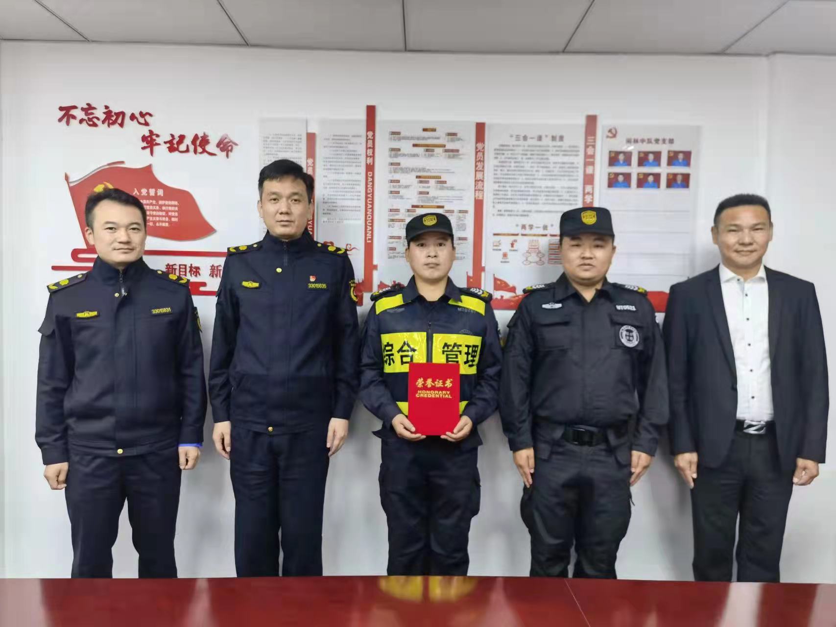 10月28日,浙江民泰駐閑林城管項(xiàng)目隊(duì)員張騰收到閑林城管中隊(duì)隊(duì)長胡迪民送來的榮譽(yù)證書和慰問補(bǔ)助金,特別獎(jiǎng)勵(lì)他在2021年服務(wù)保障徑山國慶活動(dòng)中勇救溺水女孩的行為。
