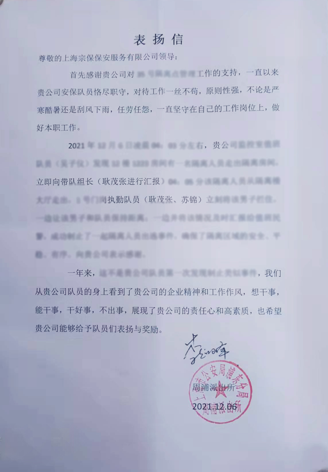 12月6日,宗保公司收到周浦派出所的表?yè)P(yáng)信,信中對(duì)宗保員工恪盡職守、認(rèn)真細(xì)致的工作表現(xiàn)提出表?yè)P(yáng)。