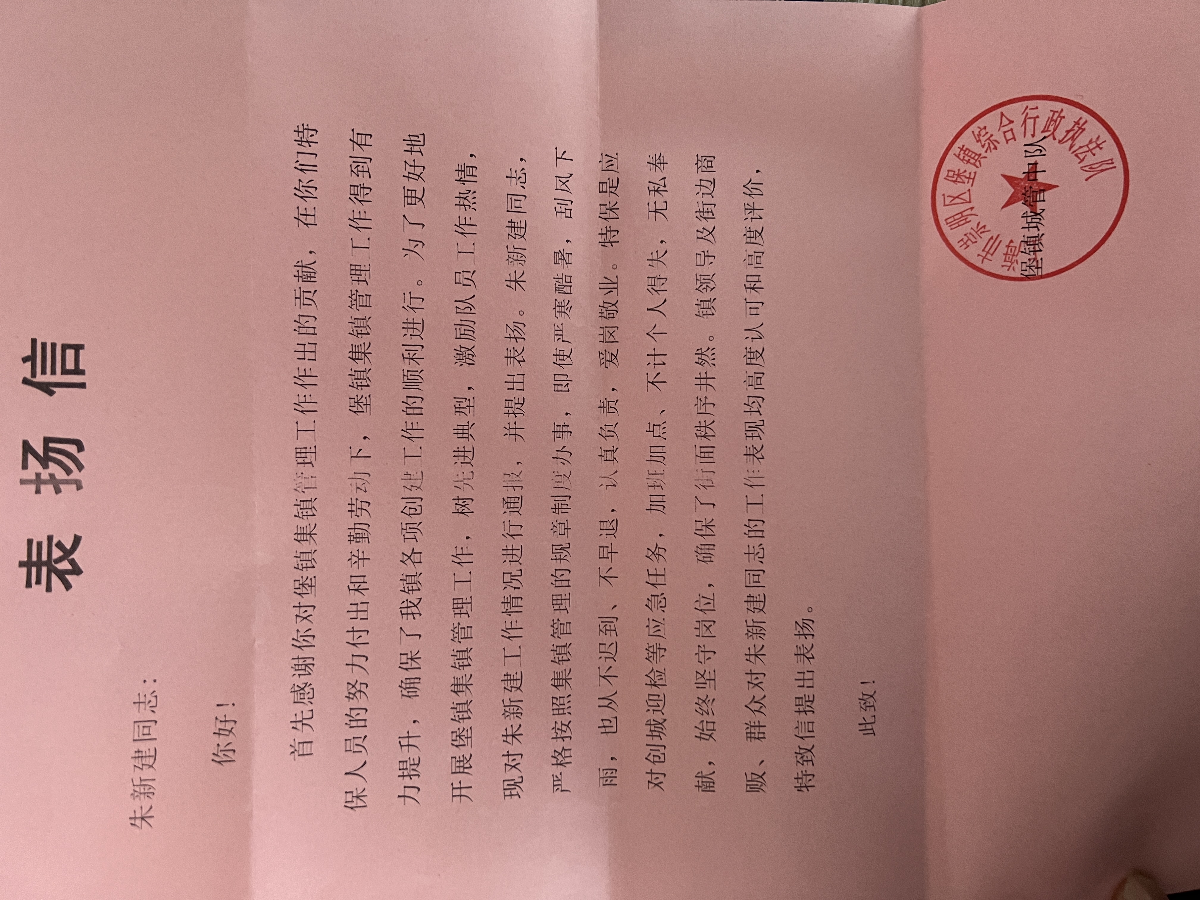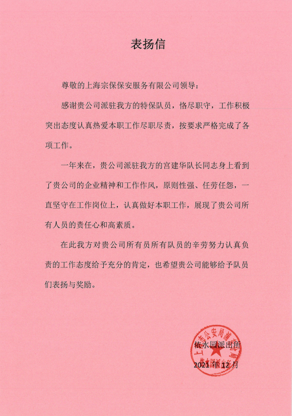 12月24日,宗保公司駐崇明堡鎮(zhèn)項(xiàng)目收到堡鎮(zhèn)城管中隊(duì)的表?yè)P(yáng)信,信中對(duì)宗保隊(duì)員朱新建盡心履責(zé)的工作表現(xiàn)提出特別表?yè)P(yáng)。