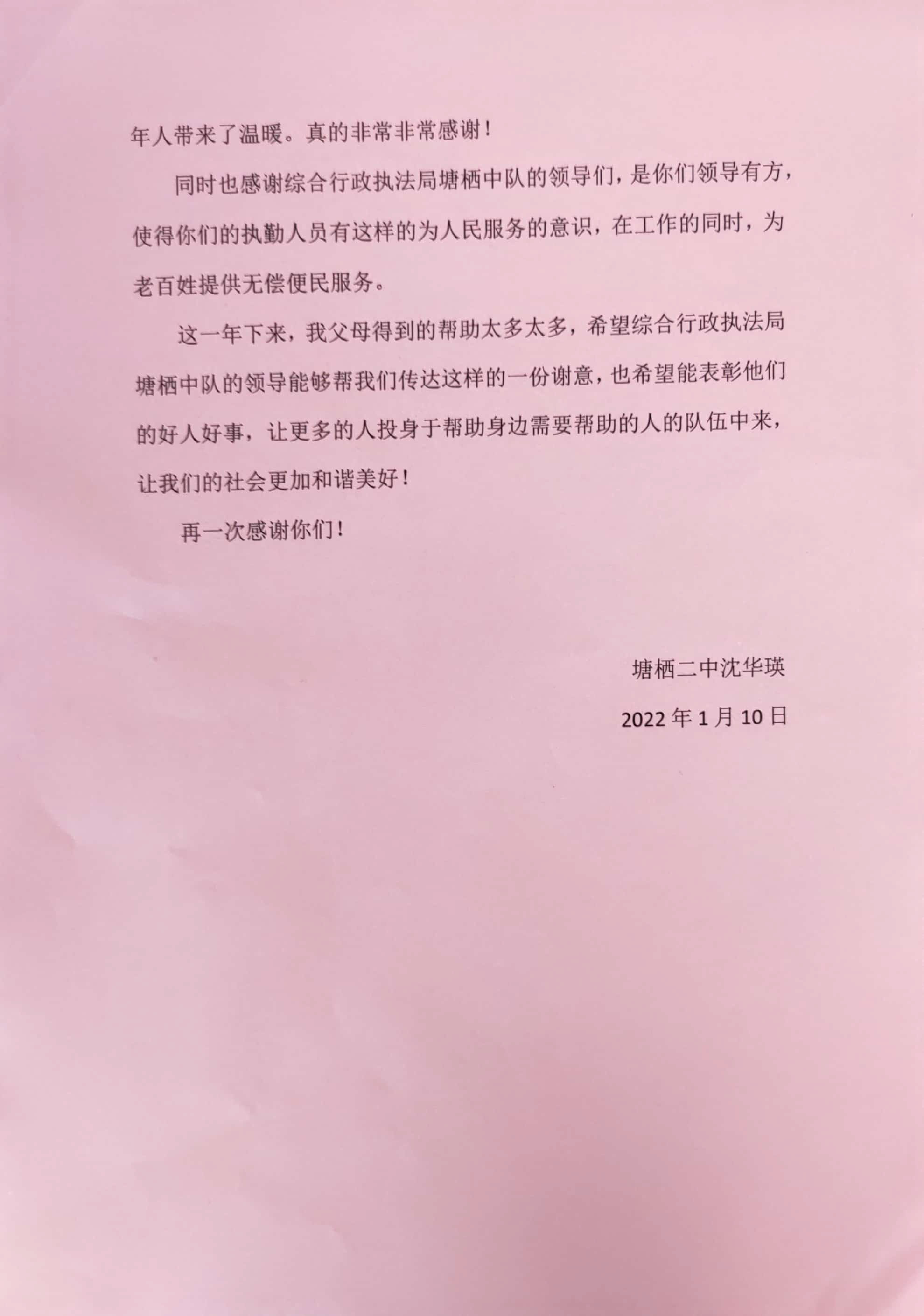 1月10日,浙江民泰駐塘棲市容項目收到塘棲二中沈華瑛老師的感謝信,信中對民泰隊員熱心幫助其父母的行為表示感謝。