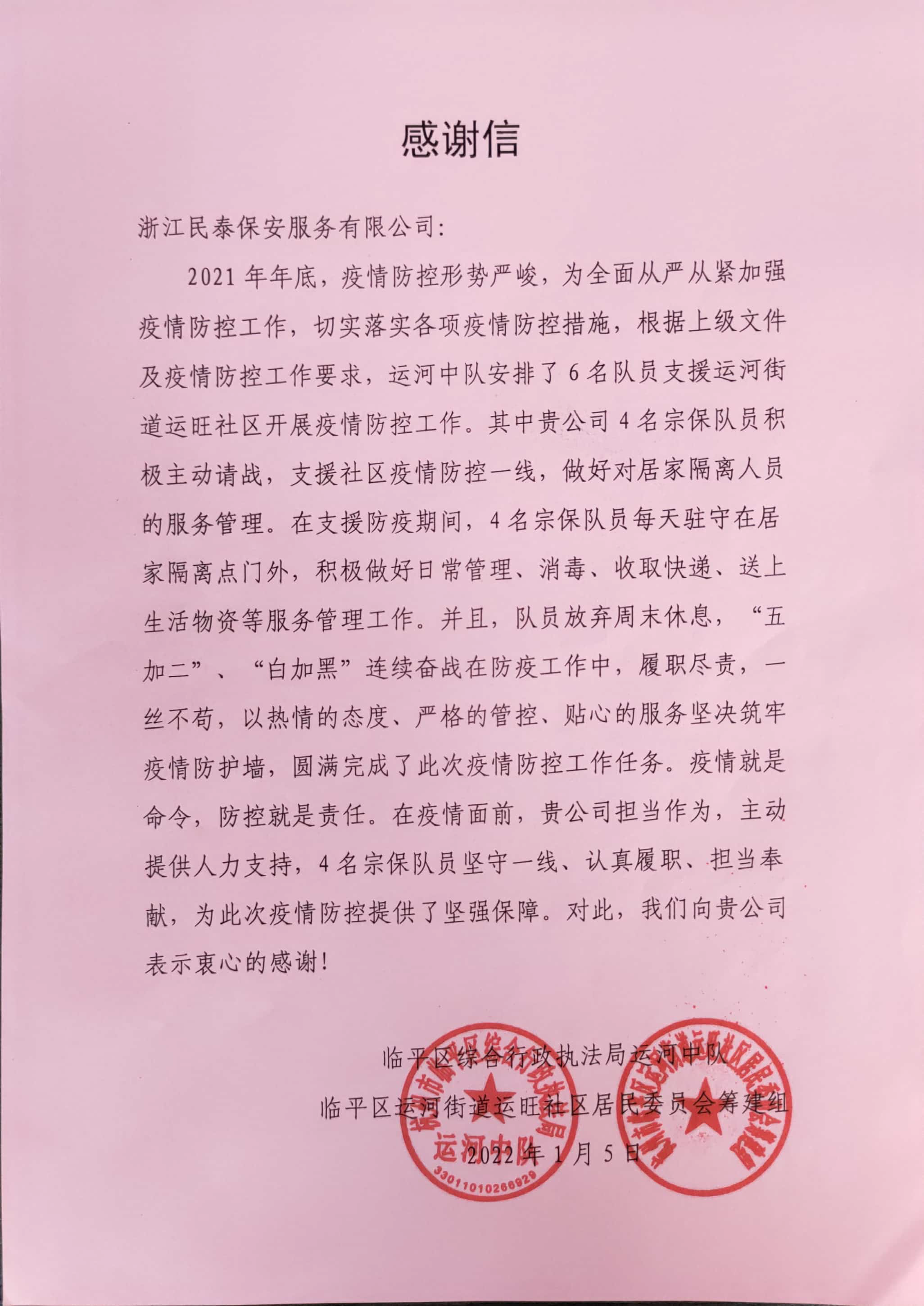 1月11日,浙江民泰駐運河市容項目收到臨平區(qū)綜合行政執(zhí)法局運河中隊和運河街道運旺社區(qū)居民委員會籌建組送來的感謝信,感謝公司對社區(qū)疫情防控工作的大力支持。