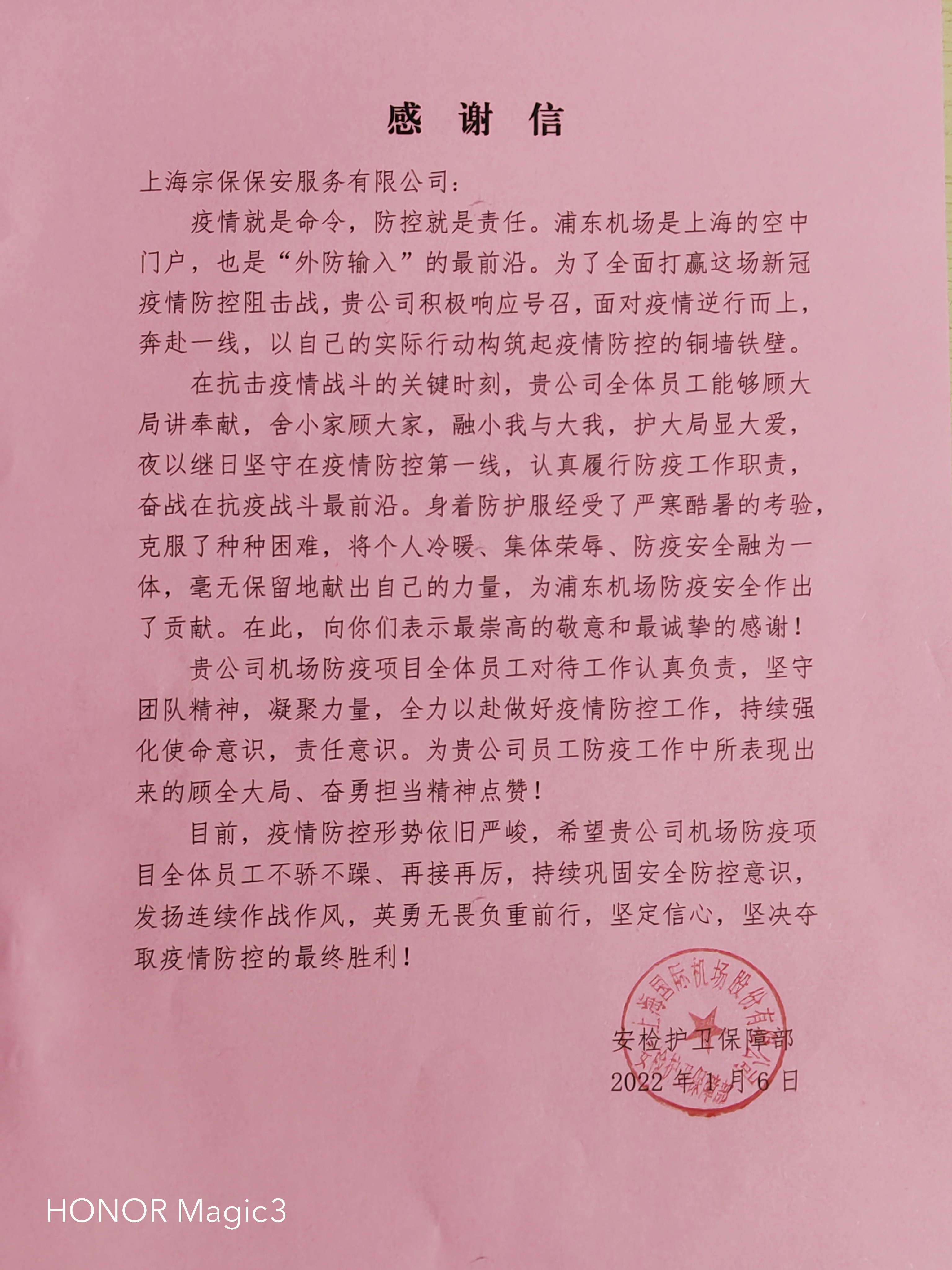 機(jī)場(chǎng)股份公司安檢護(hù)衛(wèi)保障部贈(zèng)送錦旗是對(duì)宗保公司駐機(jī)場(chǎng)防疫項(xiàng)目全體員工所做工作的肯定,不僅僅是榮譽(yù)和鼓勵(lì),更是鞭策和責(zé)任。公司將繼續(xù)發(fā)揚(yáng)主動(dòng)作為、奉獻(xiàn)擔(dān)當(dāng)?shù)淖黠L(fēng),踐行不懼風(fēng)險(xiǎn)、勇毅前行的精神,增強(qiáng)攜手共進(jìn)、履責(zé)于行的協(xié)同意識(shí),與甲方一道共同筑好浦東機(jī)場(chǎng)疫情防控銅墻鐵壁,為全力保障市民健康安全作出新貢獻(xiàn)。