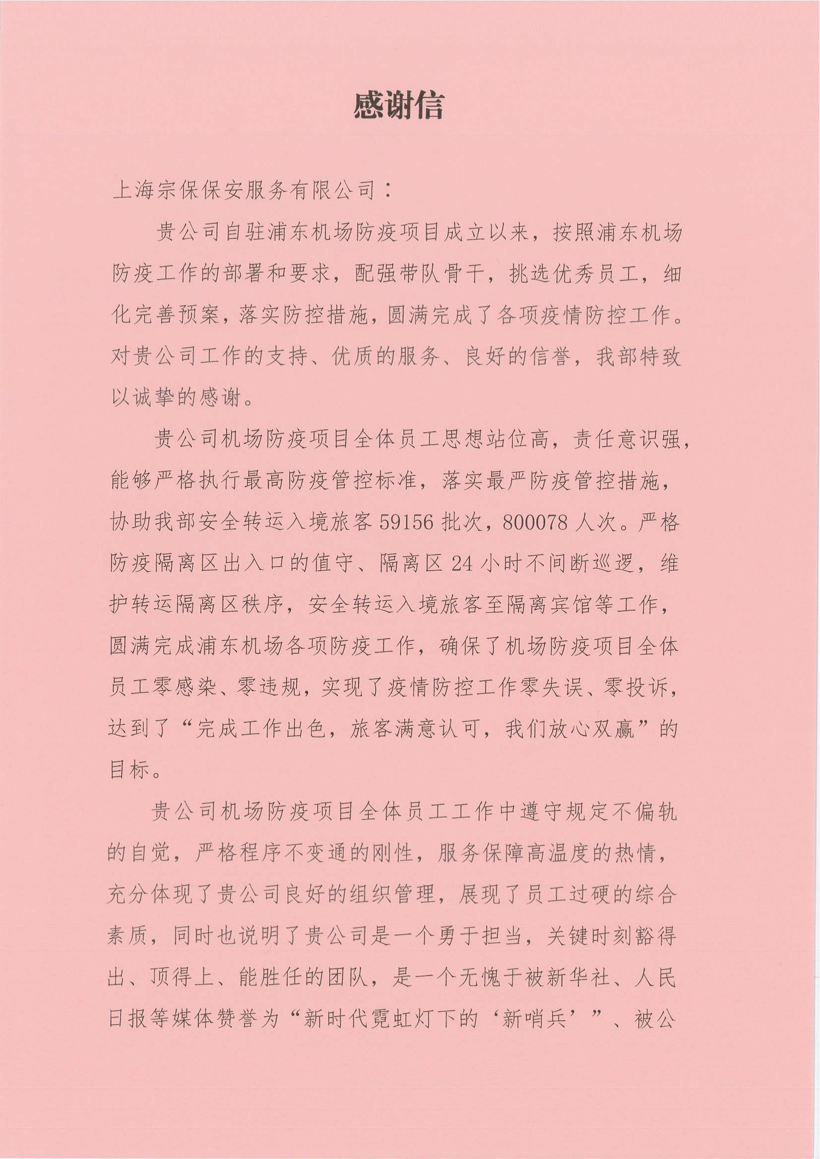 一面錦旗、一封感謝信,是對(duì)宗保公司員工機(jī)場(chǎng)防疫工作的充分肯定。宗保公司將不辜負(fù)機(jī)場(chǎng)股份公司的期望,堅(jiān)持以守土有責(zé)的擔(dān)當(dāng)情懷,以不怕吃苦的奉獻(xiàn)精神,以嚴(yán)謹(jǐn)細(xì)致的工作作風(fēng),助力守牢機(jī)場(chǎng)口岸防疫“第一關(guān)口”,堅(jiān)決配合好機(jī)場(chǎng)股份公司交通保障部筑起一道疫情防控的堅(jiān)實(shí)屏障。
