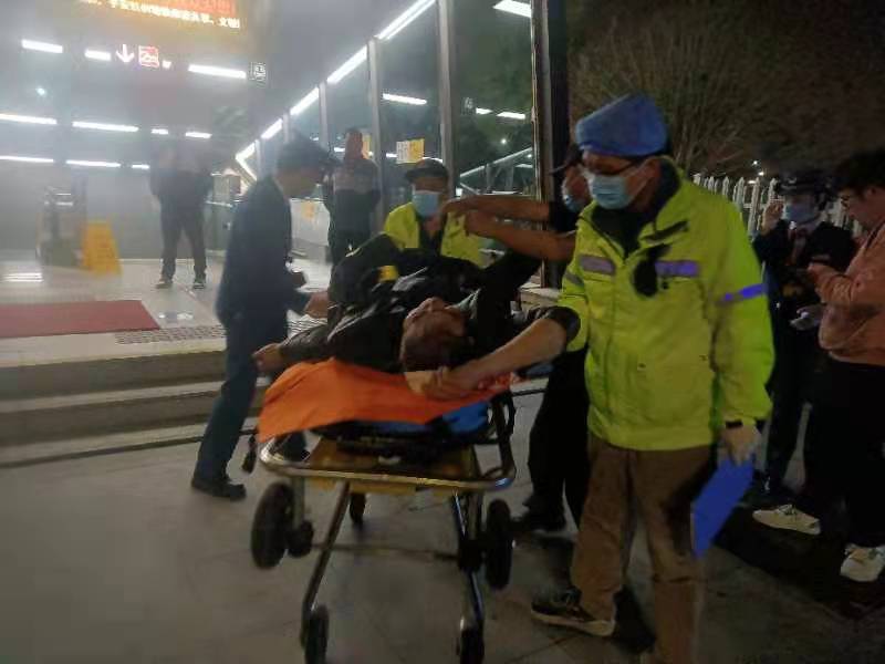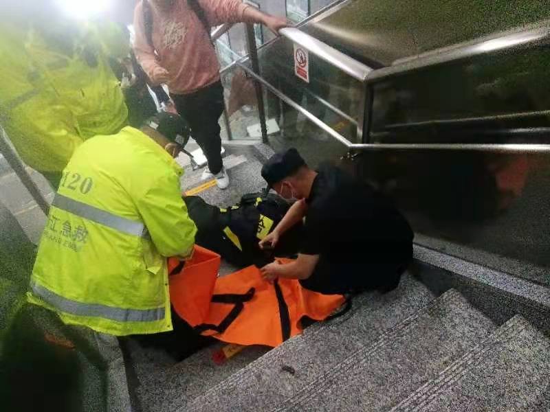當(dāng)日21:20,王艷強(qiáng)和鄭之元在地鐵二號(hào)線良渚站D出入口處巡邏時(shí),看到步梯上有一男子一動(dòng)不動(dòng)地趴在地上,頭部正在流血,旁邊站著的一個(gè)男子顯得不知所措。