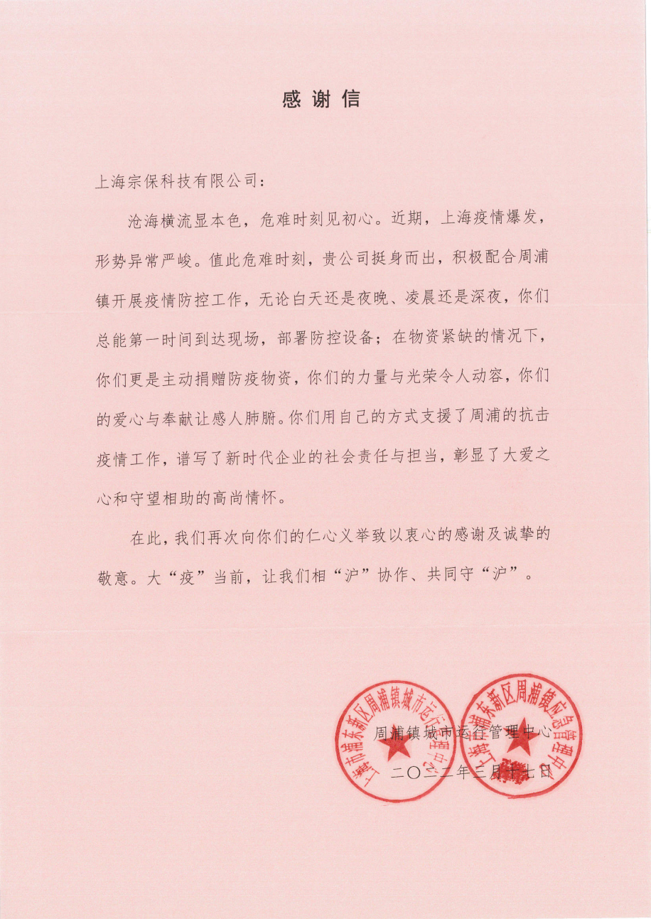 3月17日,上海宗??萍加邢薰臼盏街芷宙?zhèn)城市運(yùn)行管理中心和周浦鎮(zhèn)應(yīng)急管理中心的感謝信,感謝宗??萍紝?duì)周浦鎮(zhèn)疫情防控工作的大力支持。