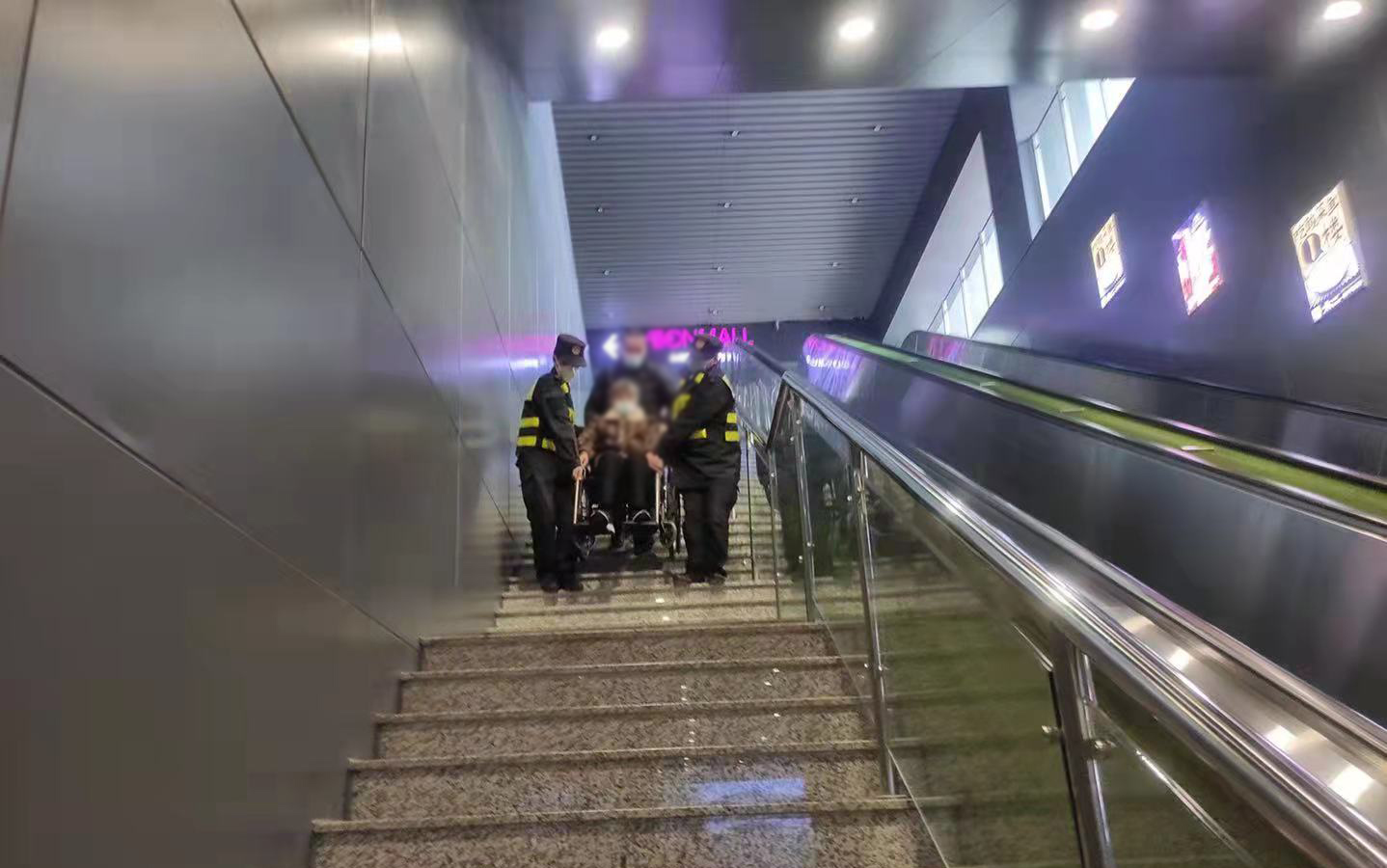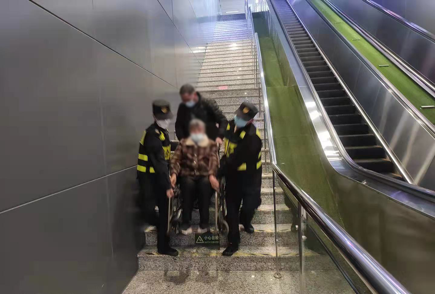 當(dāng)日10:20,張彬洋和樊粵強(qiáng)在地鐵2號線杜甫村站值勤時(shí),看見有位老人推著輪椅,輪椅上還坐著一位老人,在地鐵出入口駐足觀望,徘徊不前。見此情形,兩位隊(duì)員立即上前詢問是否需要幫助。