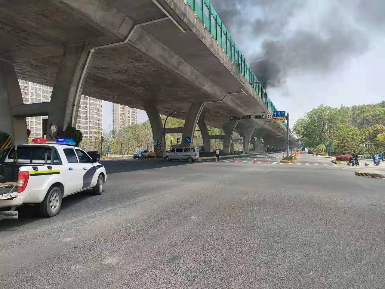 當(dāng)幾個人趕到高架橋下時(shí),發(fā)現(xiàn)高速隔離板處有明火在燃燒,玻璃碎渣不時(shí)掉落下來,橋下情況十分危險(xiǎn)。見此情形,馮奧立即將情況上報(bào)工作站值班領(lǐng)導(dǎo),協(xié)助引導(dǎo)路面車輛避開繞行,安排同事封閉右轉(zhuǎn)專用車道,避免過往車輛和行人受到傷害。
