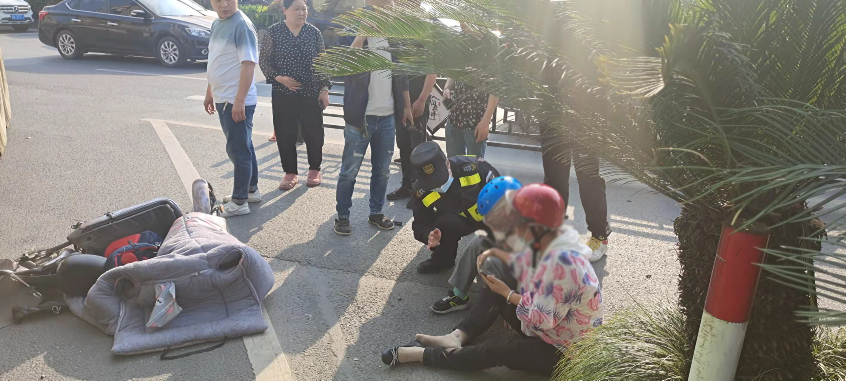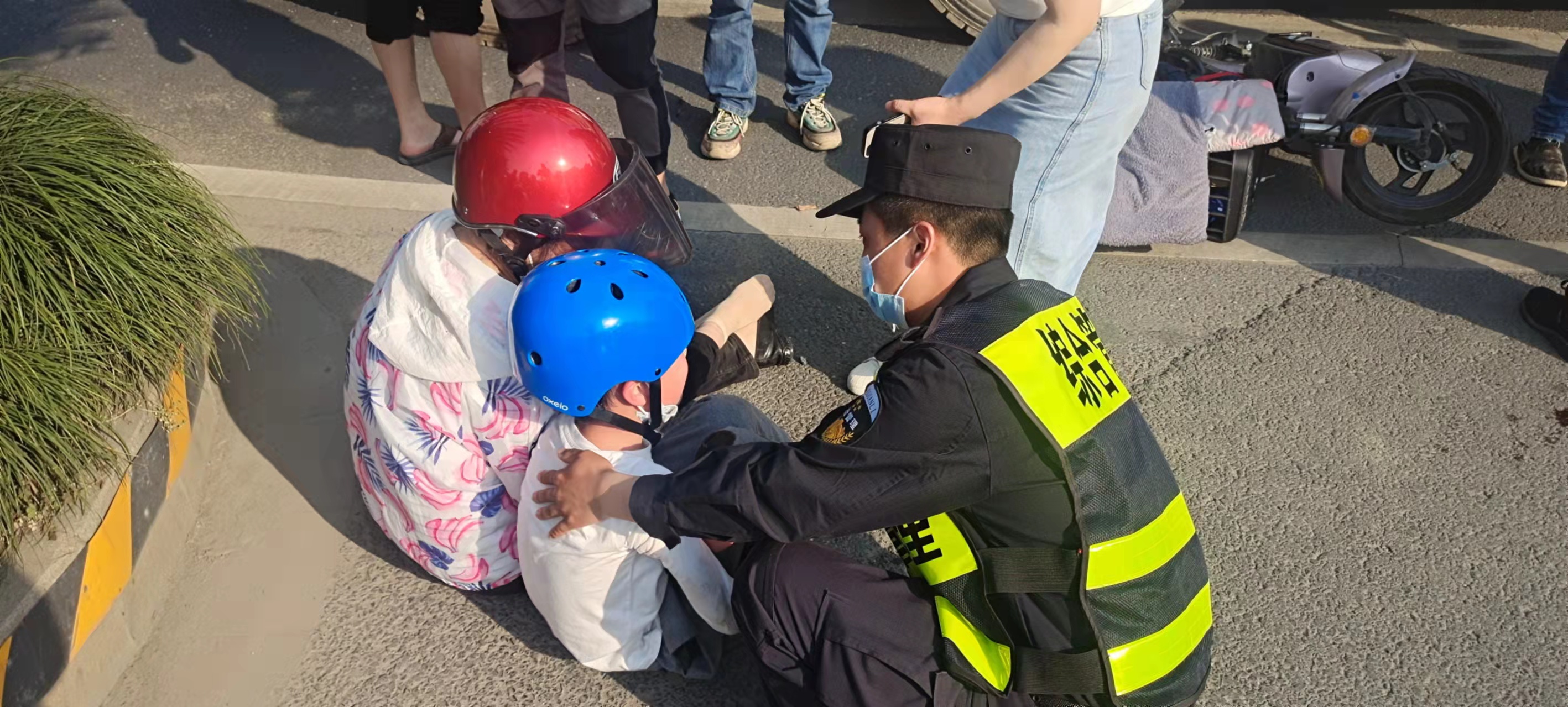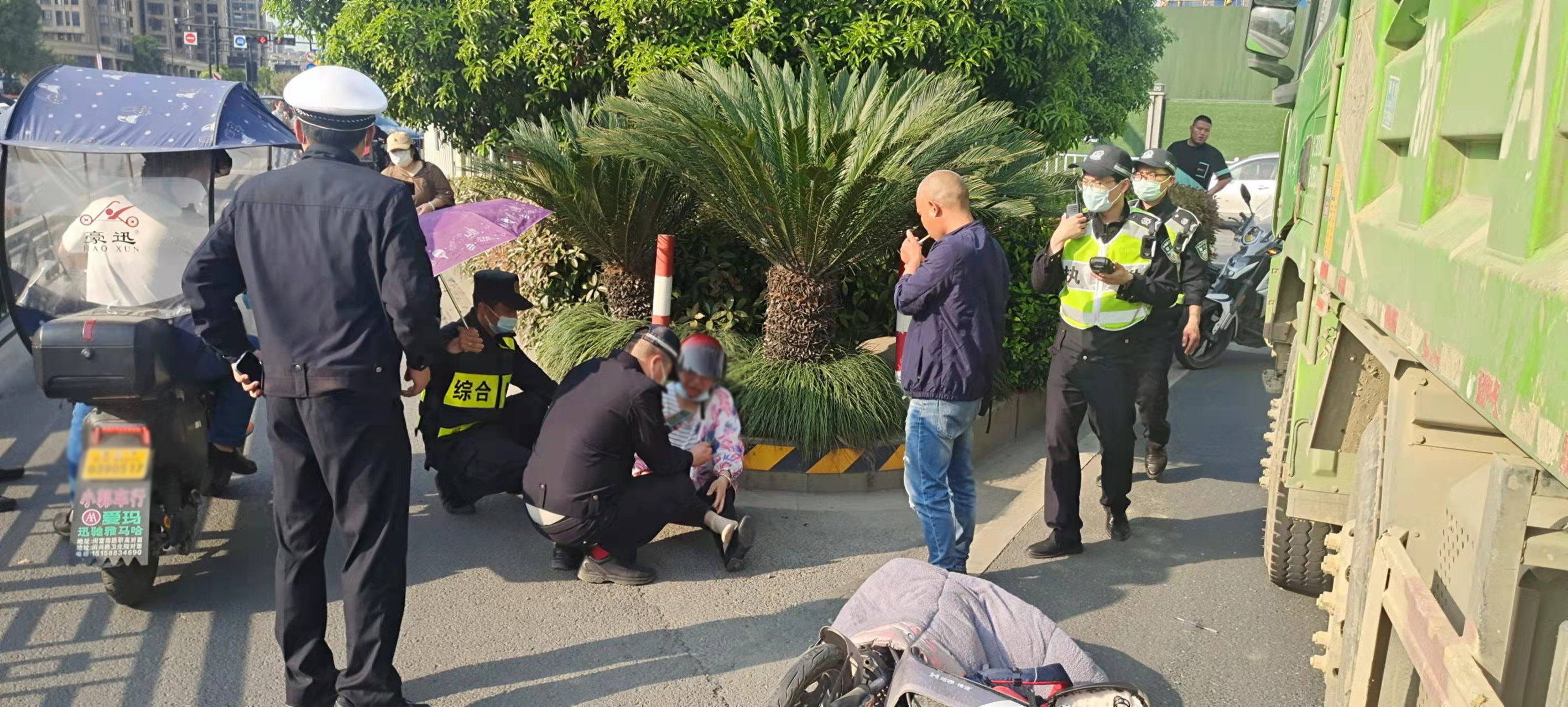 當(dāng)天16:05分,董波、高勛在閑富南路與閑林中路路口巡邏時(shí),恰好看到前方一輛大型土方車右轉(zhuǎn)時(shí)將一輛兩輪電動車撞翻了,騎電瓶車上母子被摔倒在地。
