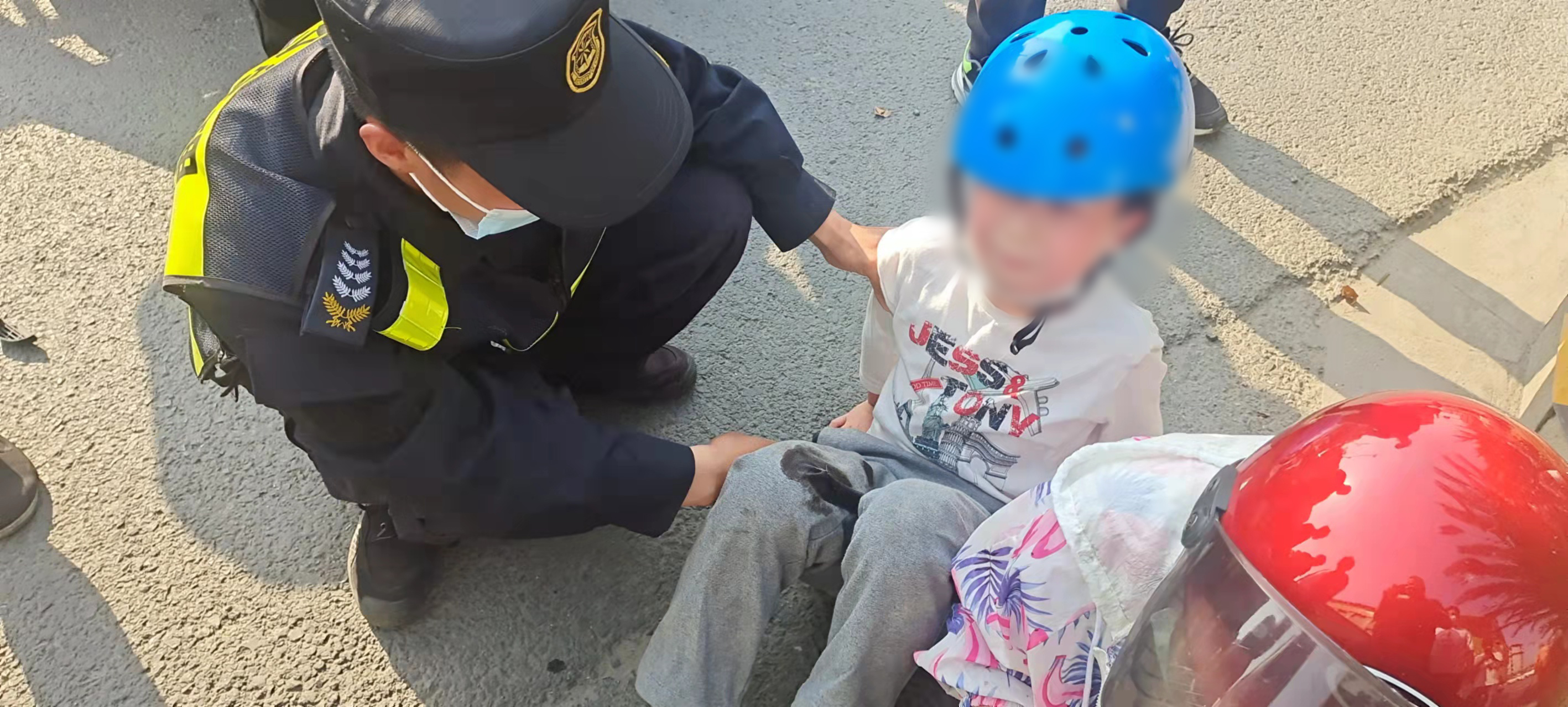 見此情形,隊(duì)員高勛立即飛奔過去,趕緊喊停土方車司機(jī)。董波則趕緊上前查看母子受傷情況,母親的嘴上鮮血直流,口罩也被染紅了,小男孩的腿部受傷嚴(yán)重,無法站立。高勛一邊安慰驚魂未定的母子,一邊提醒土方車司機(jī)撥打120急救電話和110報(bào)警電話。