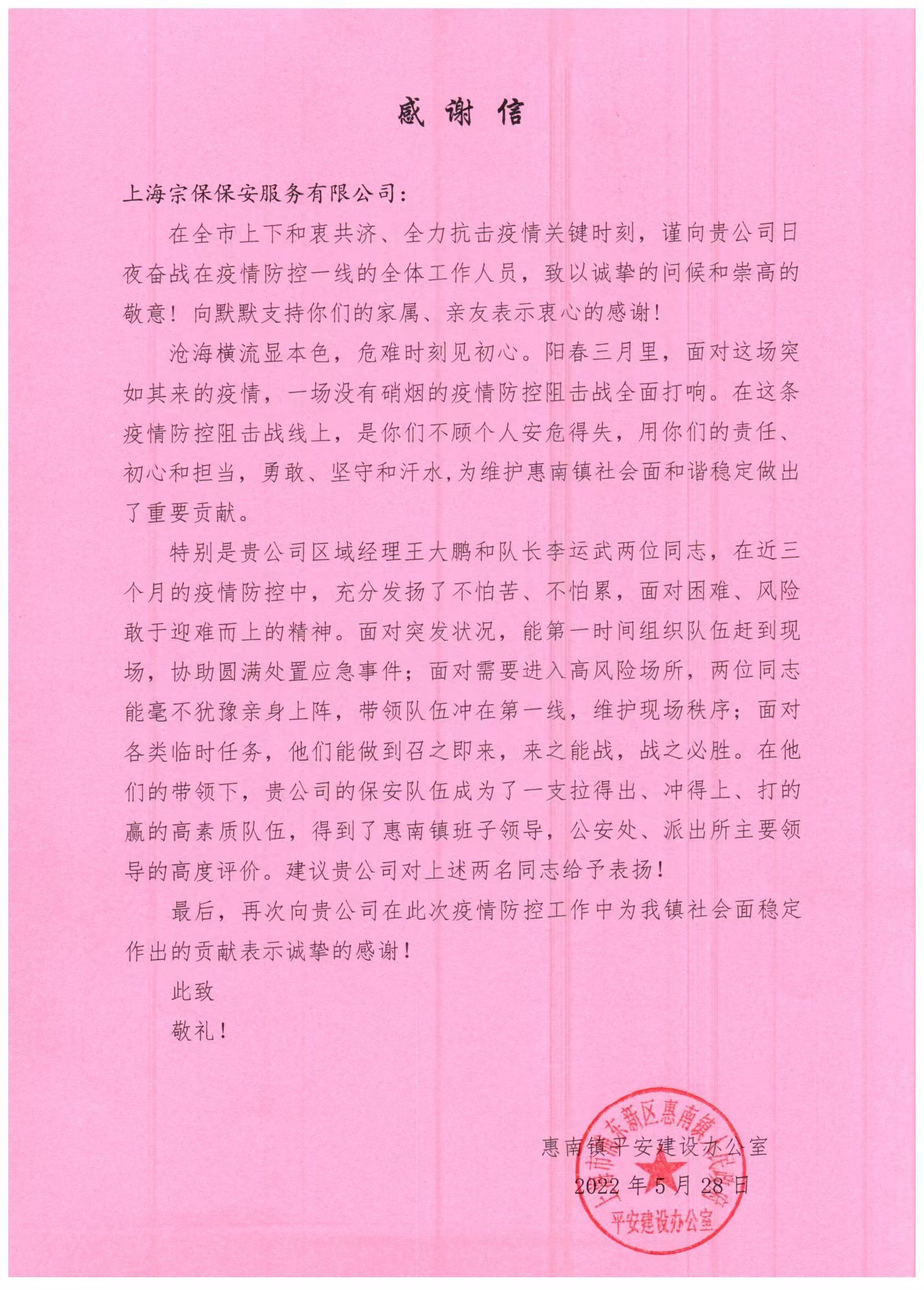 5月28日,宗保公司收到惠南鎮(zhèn)平安建設(shè)辦公室的感謝信,信中衷心感謝公司為惠南鎮(zhèn)疫情防控提供的有力保障和所做的艱辛付出。