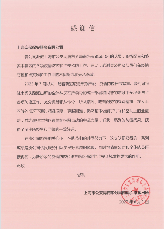 6月1日,宗保公司收到浦東公安分局南碼頭路派出所的感謝信,信中對公司員工在疫情防控期間的辛勤付出和無私奉獻表示肯定與感謝。