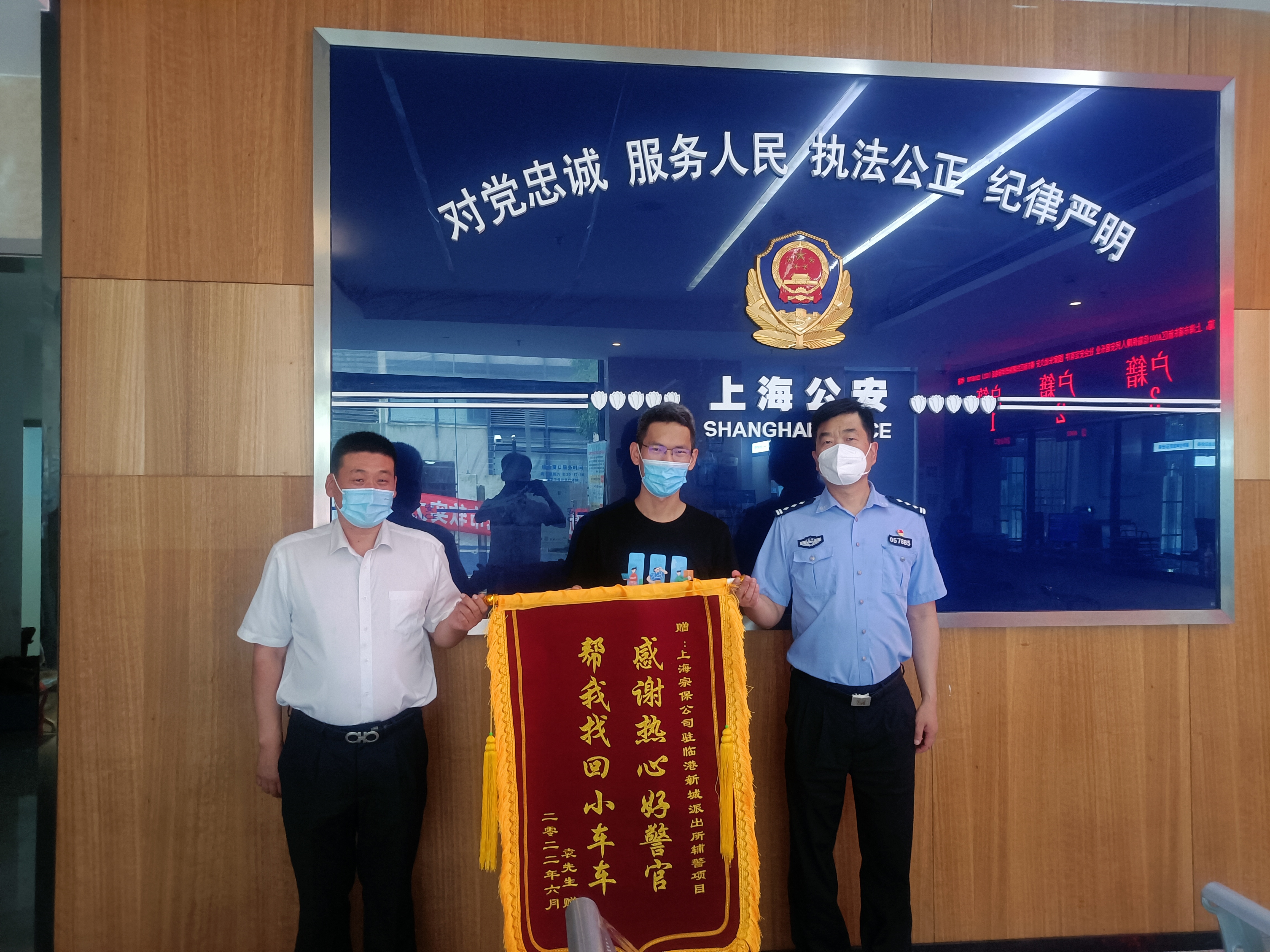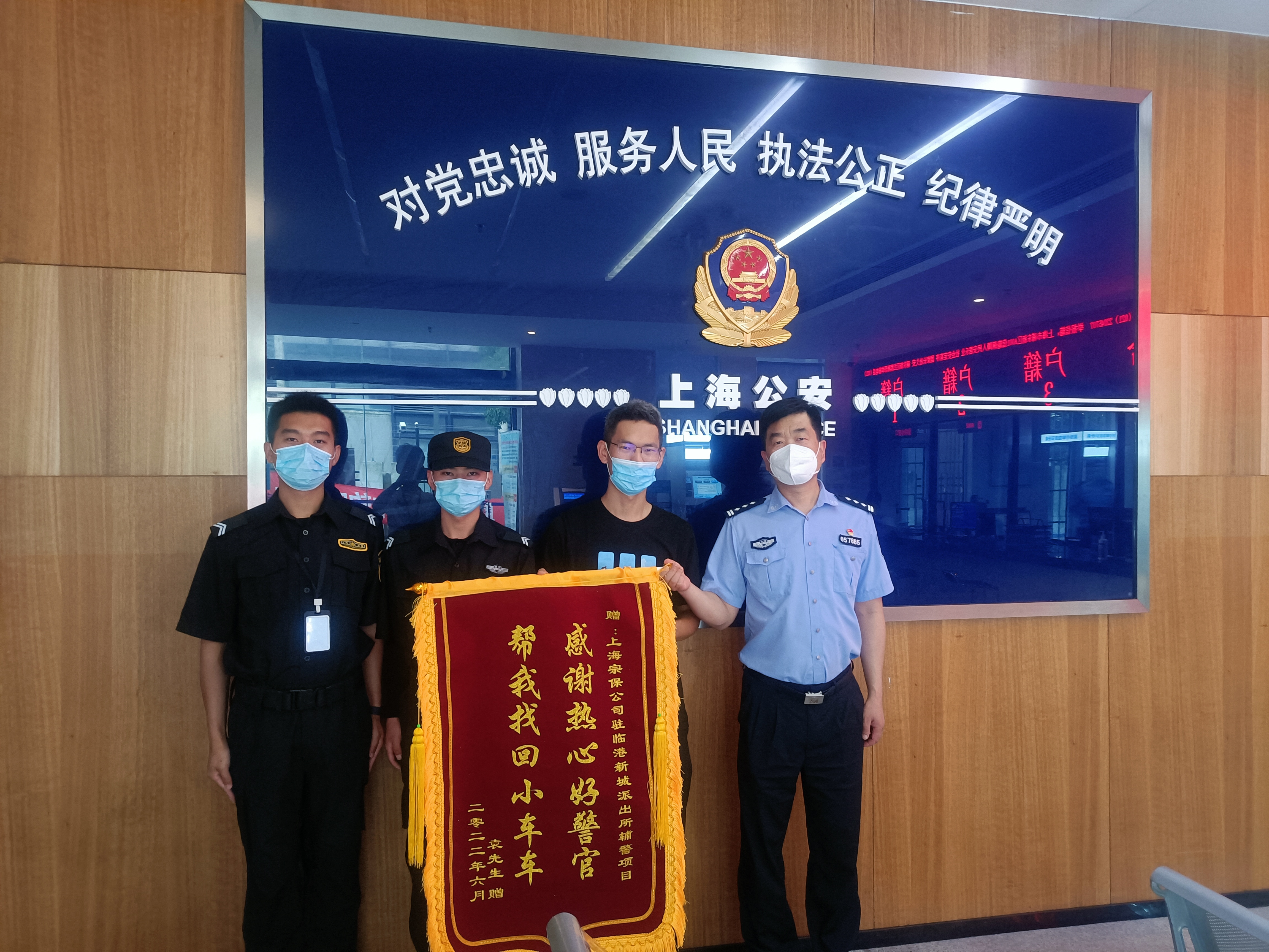 6月24日,市民袁先生將一面繡有“感謝熱心好警官 幫我找回小車車”的錦旗贈送給宗保公司駐臨港新城派出所輔警項目隊員楊明來,感謝他幫忙找回被盜電動車。