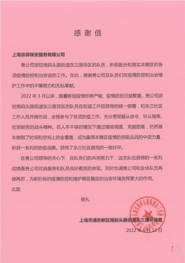 一面錦旗、一封感謝信,見證了宗保員工共克時艱、抗擊疫情的風(fēng)采,展現(xiàn)了宗保員工同心同德、勇往直前的擔(dān)當(dāng)。在常態(tài)化疫情防控形勢下,宗保員工將再接再厲、持續(xù)努力,以更加扎實的工作作風(fēng)、更加認(rèn)真的工作態(tài)度、更加嚴(yán)格的工作要求,配合開展好社區(qū)居委的疫情防控工作,為助力筑牢東三里橋疫情防控屏障貢獻(xiàn)自己的力量。