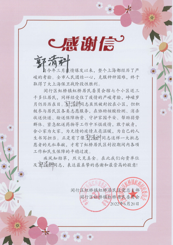 6月30日,閔行區(qū)虹橋鎮(zhèn)虹橋居民區(qū)黨總支部和閔行區(qū)虹橋鎮(zhèn)虹橋居民委員會送來感謝信,真摯地感謝疫情防控期間宗保員工全力配合居委開展疫情防控所做的工作。