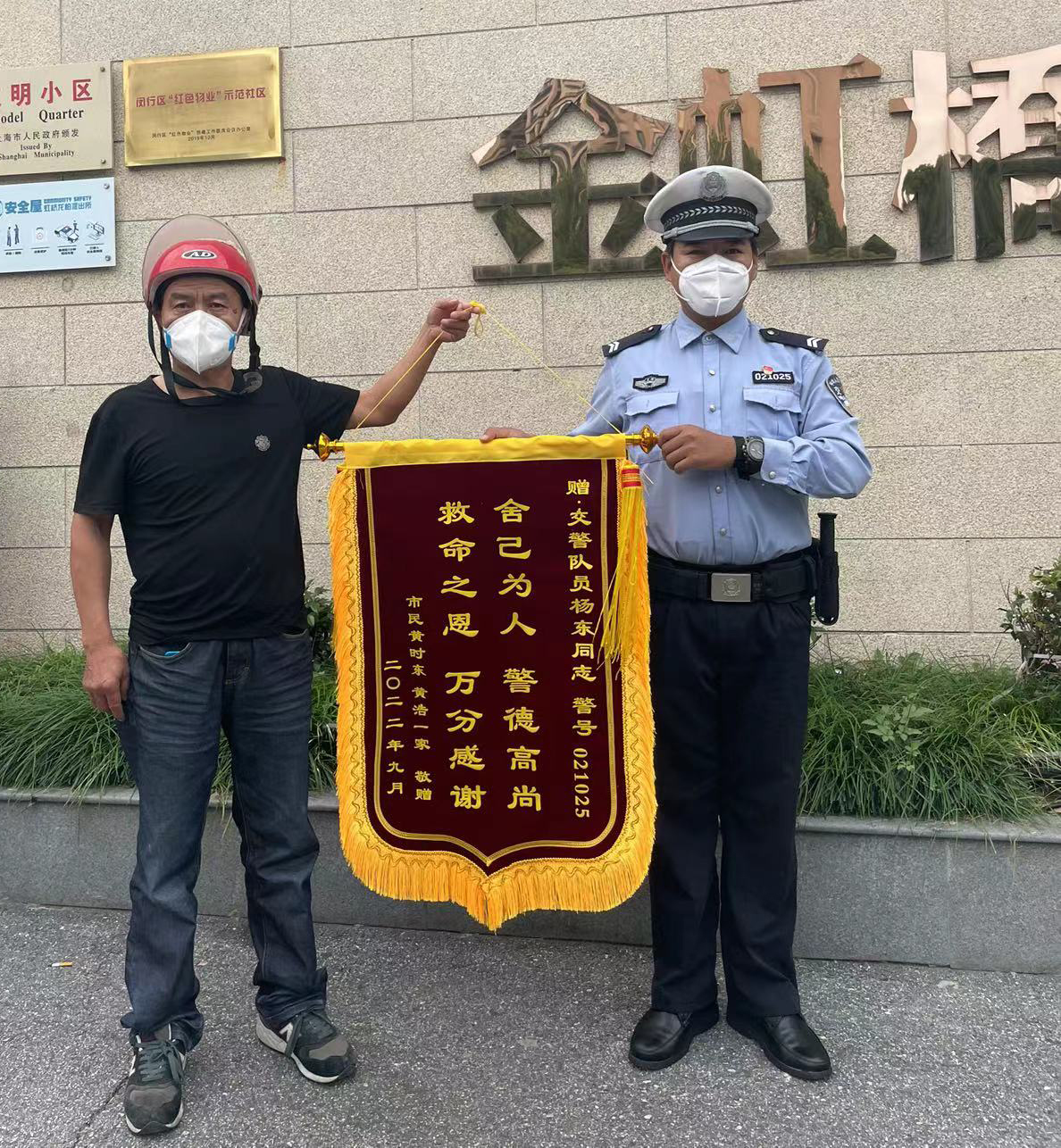 9月21日,宗保公司駐閔行交管輔助項目收到市民黃先生送來的一面繡有“舍已為人 警德高尚 救命之恩 萬分感謝”的錦旗,感謝宗保員工楊東熱心救自己落水母親的行為。