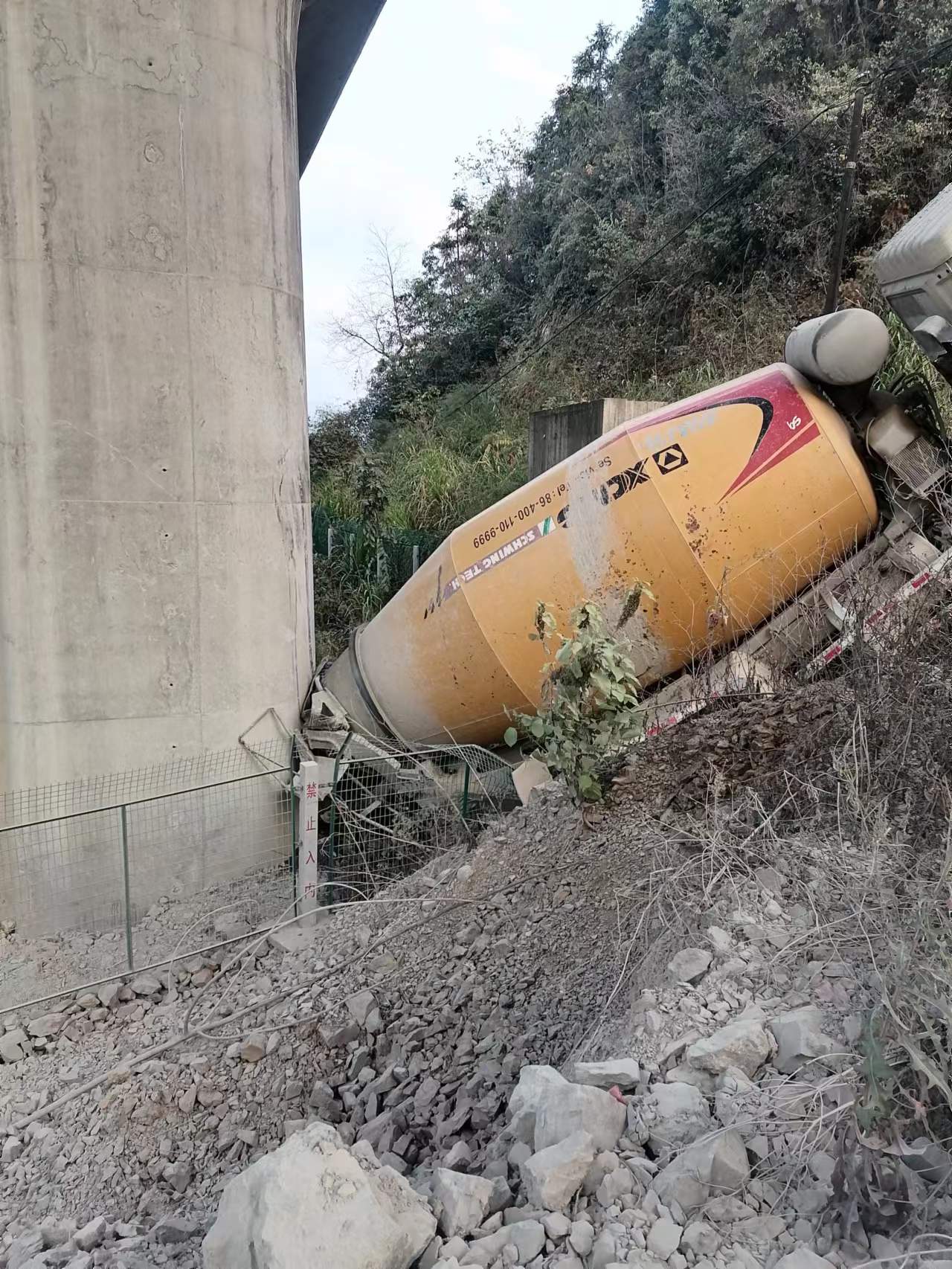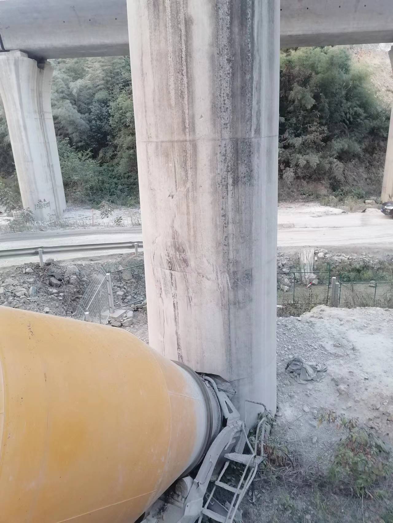 當(dāng)日16:52,公司員工吳敏紅在杭黃高鐵外塢特大橋K123+161處巡邏時(shí),發(fā)現(xiàn)一輛水泥罐車(chē)從20號(hào)橋墩處掉下,撞擊并卡在橋墩上動(dòng)彈不得,嚴(yán)重威脅著高鐵線(xiàn)路的行車(chē)安全。
