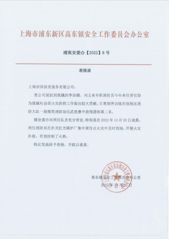 10月20日,宗保公司收到浦東新區(qū)高東鎮(zhèn)安全工作委員會(huì)辦公室的表?yè)P(yáng)函,函中對(duì)公司員工李宗臻和劉義來(lái)奮力救火的突出表現(xiàn)給予表?yè)P(yáng)。