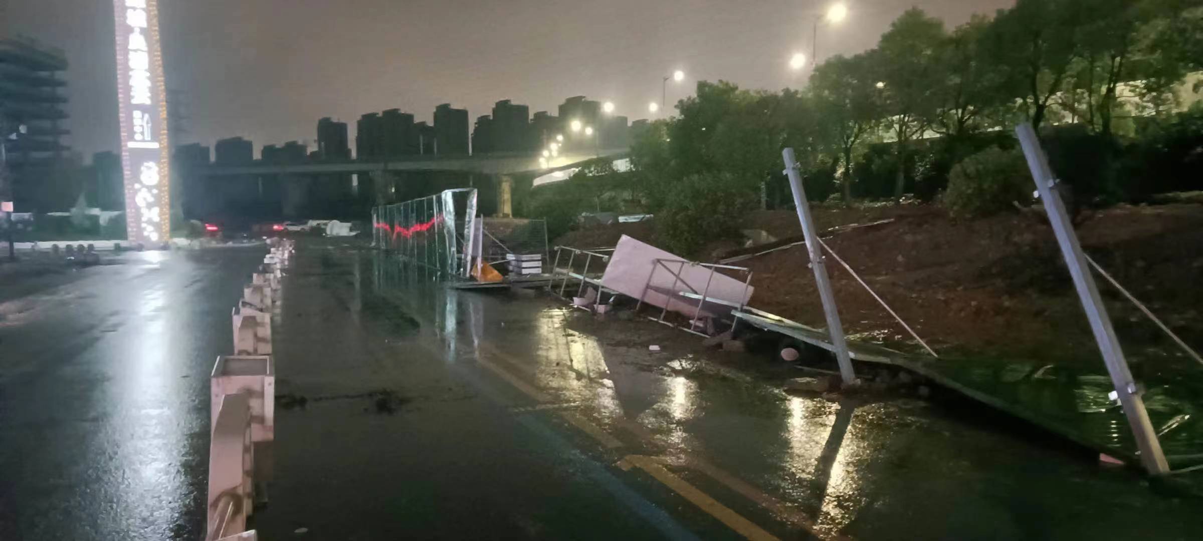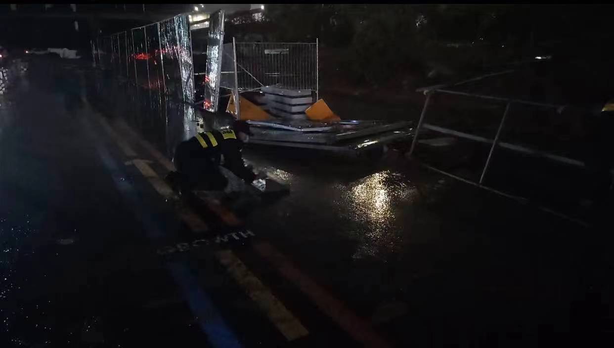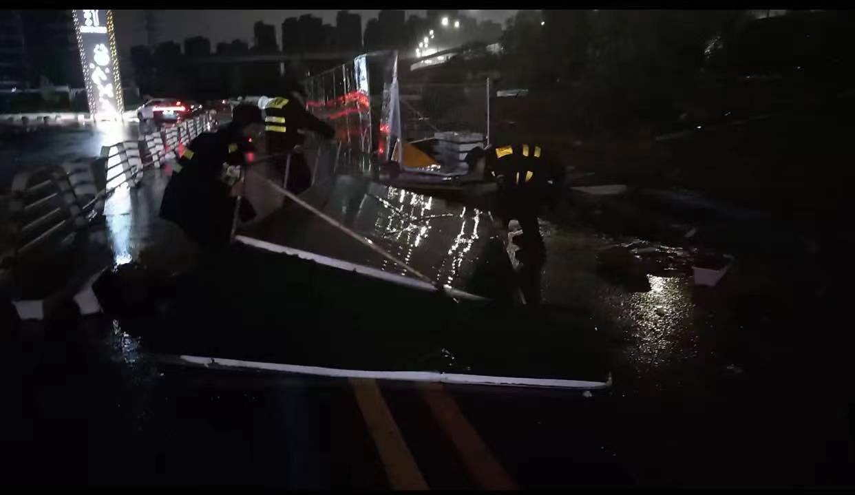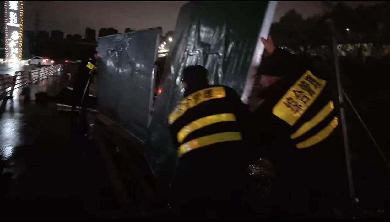當(dāng)日20:12,公司員工黃華和郭子威在嚴(yán)村里路古墩路口巡邏時(shí),看到馬路邊施工的綠色圍擋被風(fēng)吹倒,占據(jù)半幅車道,嚴(yán)重影響車輛通行,而當(dāng)時(shí)正下著大雨,再加上天色已暗,存在著極大的安全隱患。