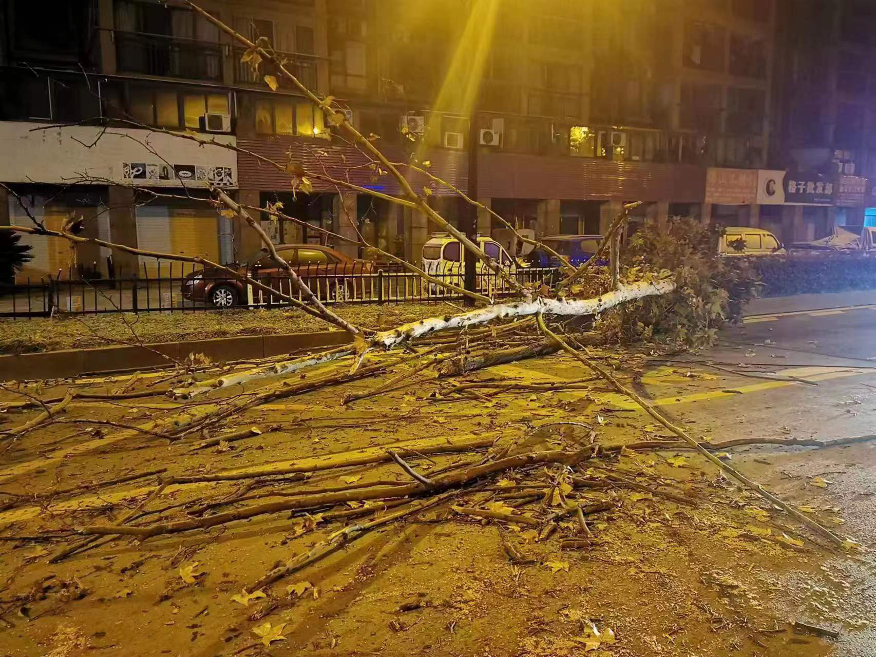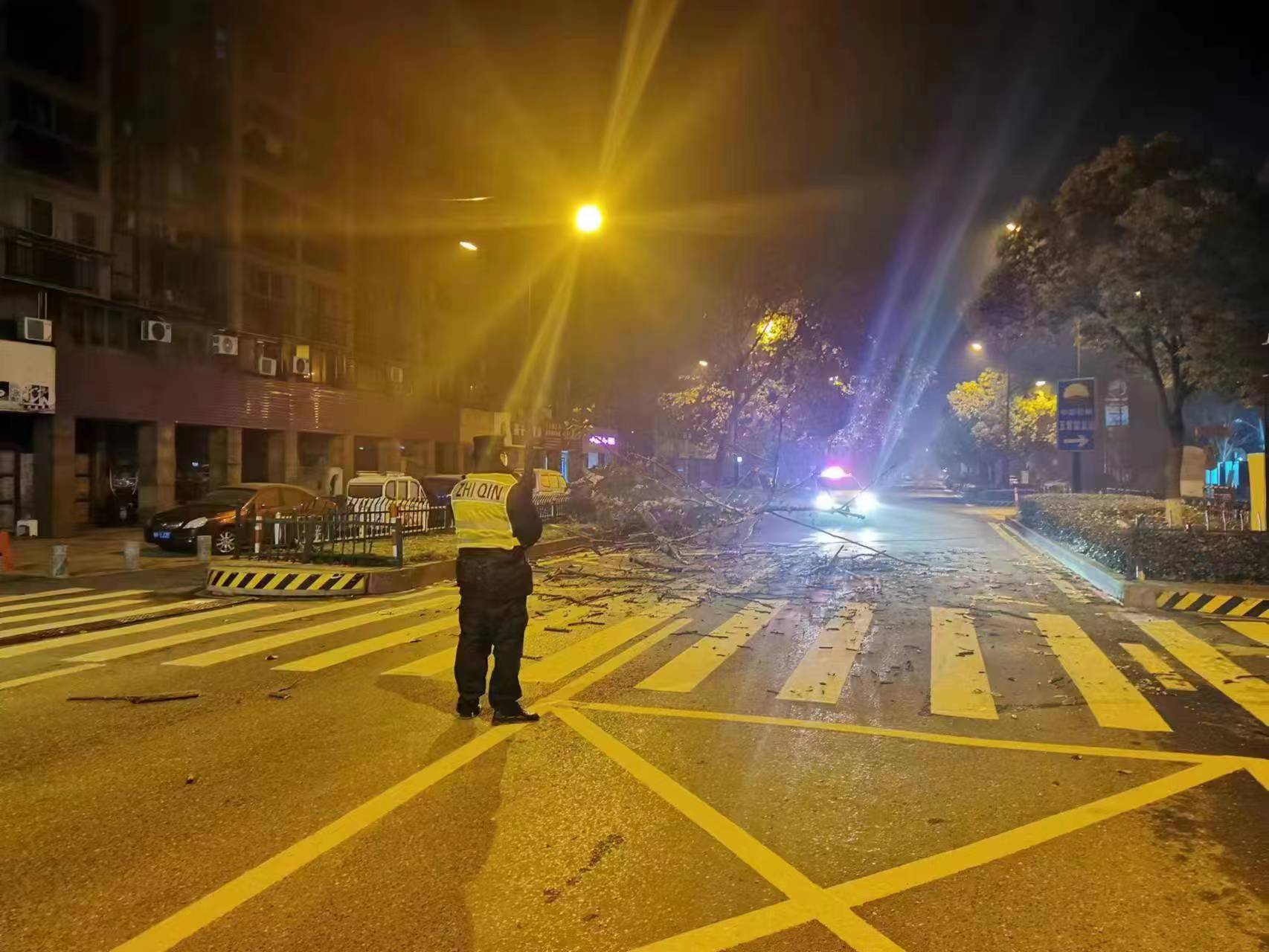 兩人迅疾來到現(xiàn)場(chǎng),一棵大樹折斷后橫在馬路上,凌亂的枝干正好將馬路攔腰截?cái)?,車輛通行嚴(yán)重受阻。由于時(shí)值凌晨,附近商戶沒有開門,兩人也無排障工具,于是就在現(xiàn)場(chǎng)設(shè)立了警戒線,向指揮中心報(bào)告情況并呼叫增援。