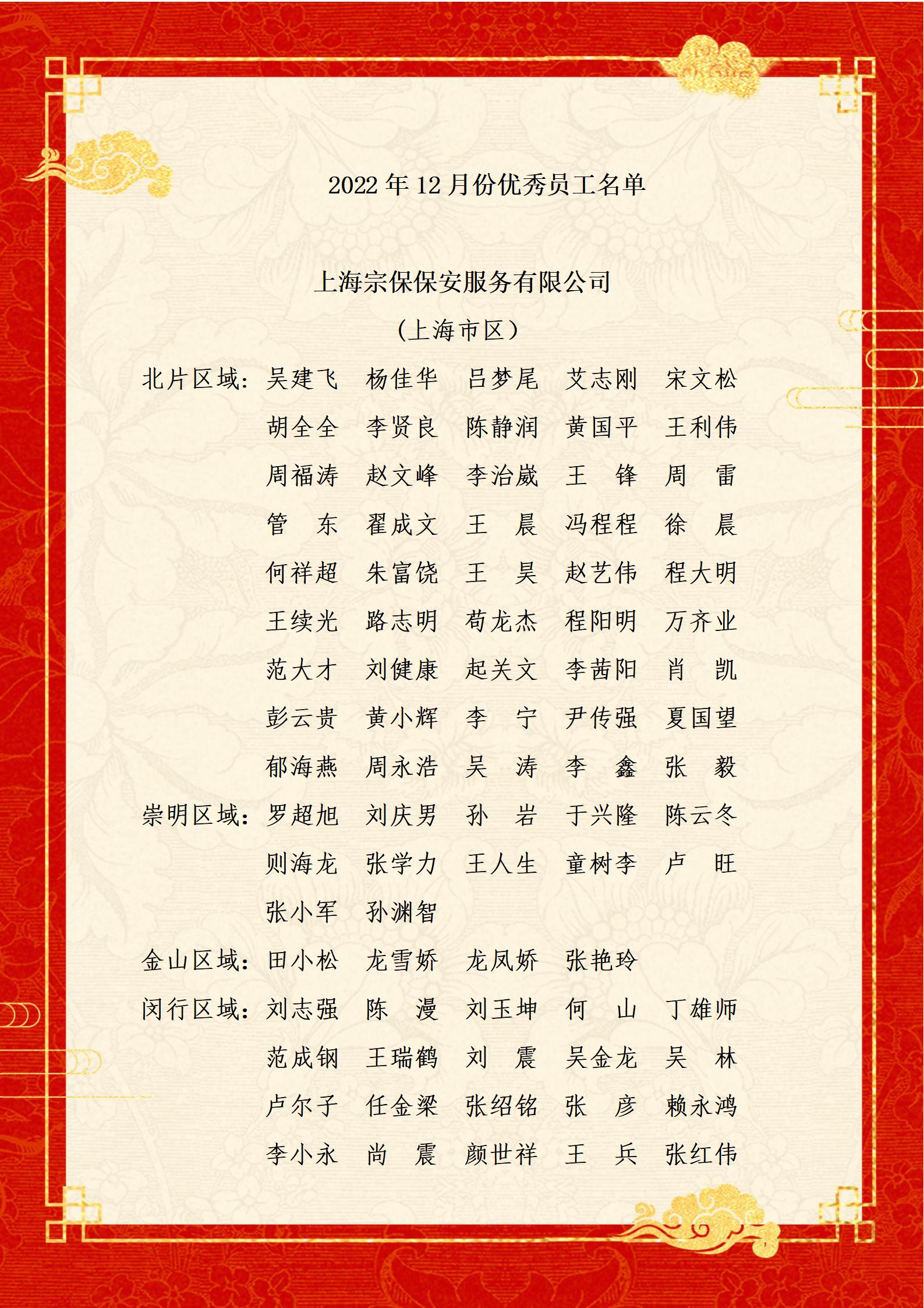 12月份,公司廣大員工根據(jù)甲方的任務(wù)部署,按照公司的工作要求,不怕濕寒、連續(xù)奮戰(zhàn),全力協(xié)助完成了上海市徐匯區(qū)第十七屆人民代表大會第二次會議安保任務(wù),勠力輔助進(jìn)行冬至祭掃安全保障,竭力配合做好城市管理、治安聯(lián)防、物業(yè)服務(wù)、生態(tài)保護(hù)、高鐵巡防等工作。期間,涌現(xiàn)出了一批盡心履責(zé)、崗位建功、拾金不昧、熱心助人的優(yōu)秀員工和先進(jìn)典型。