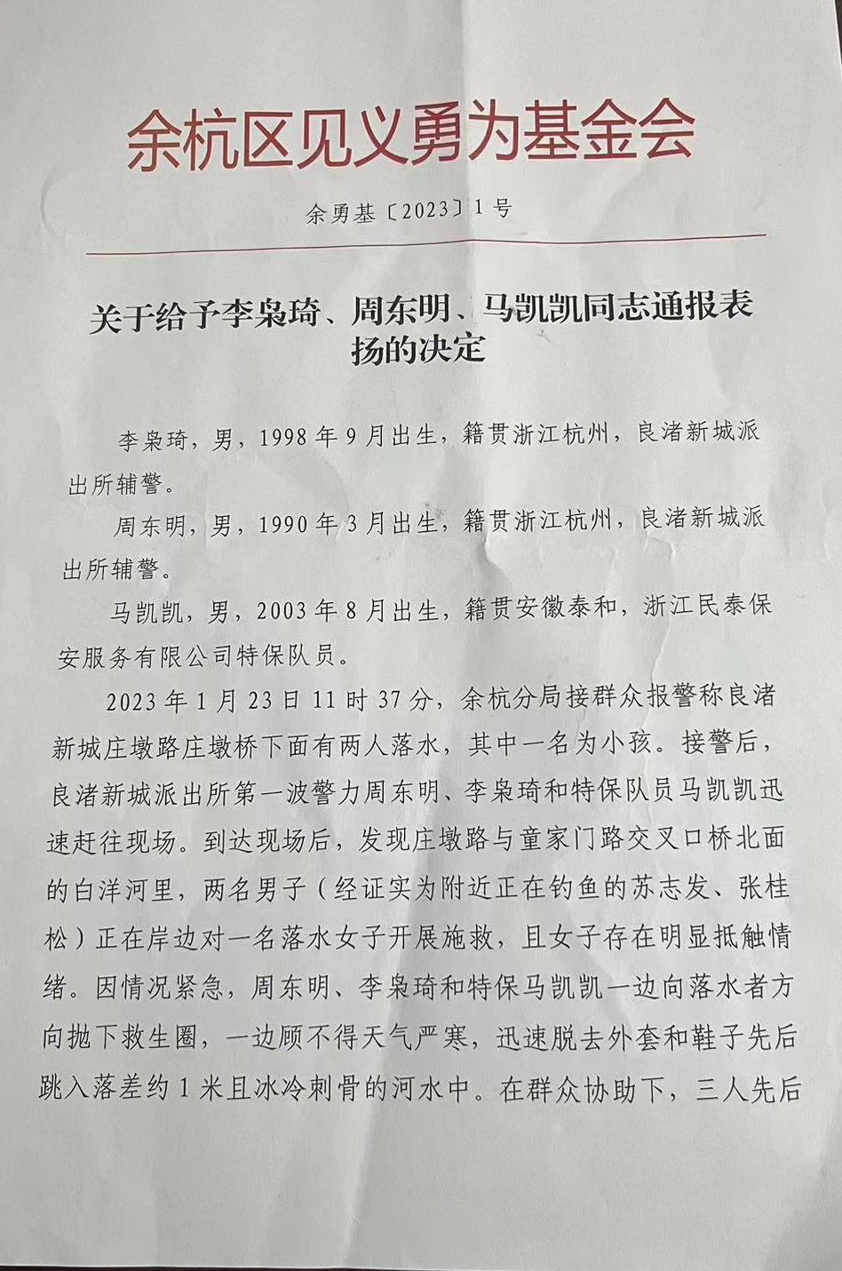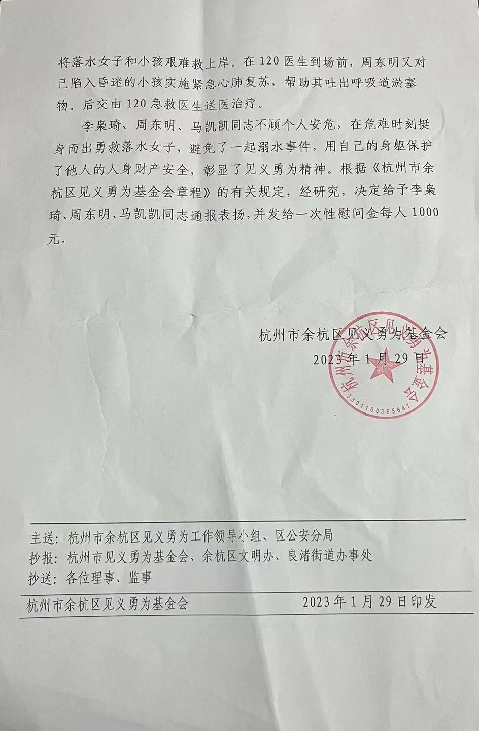 1月29日,浙江民泰公司駐杭州市余杭區(qū)良渚新城派出所輔助項(xiàng)目收到良渚新城派出所的表?yè)P(yáng)函,員工馬凱凱不顧個(gè)人安危勇救落水人員的行為受到了杭州市余杭區(qū)見義勇為基金會(huì)的通報(bào)表?yè)P(yáng)。
