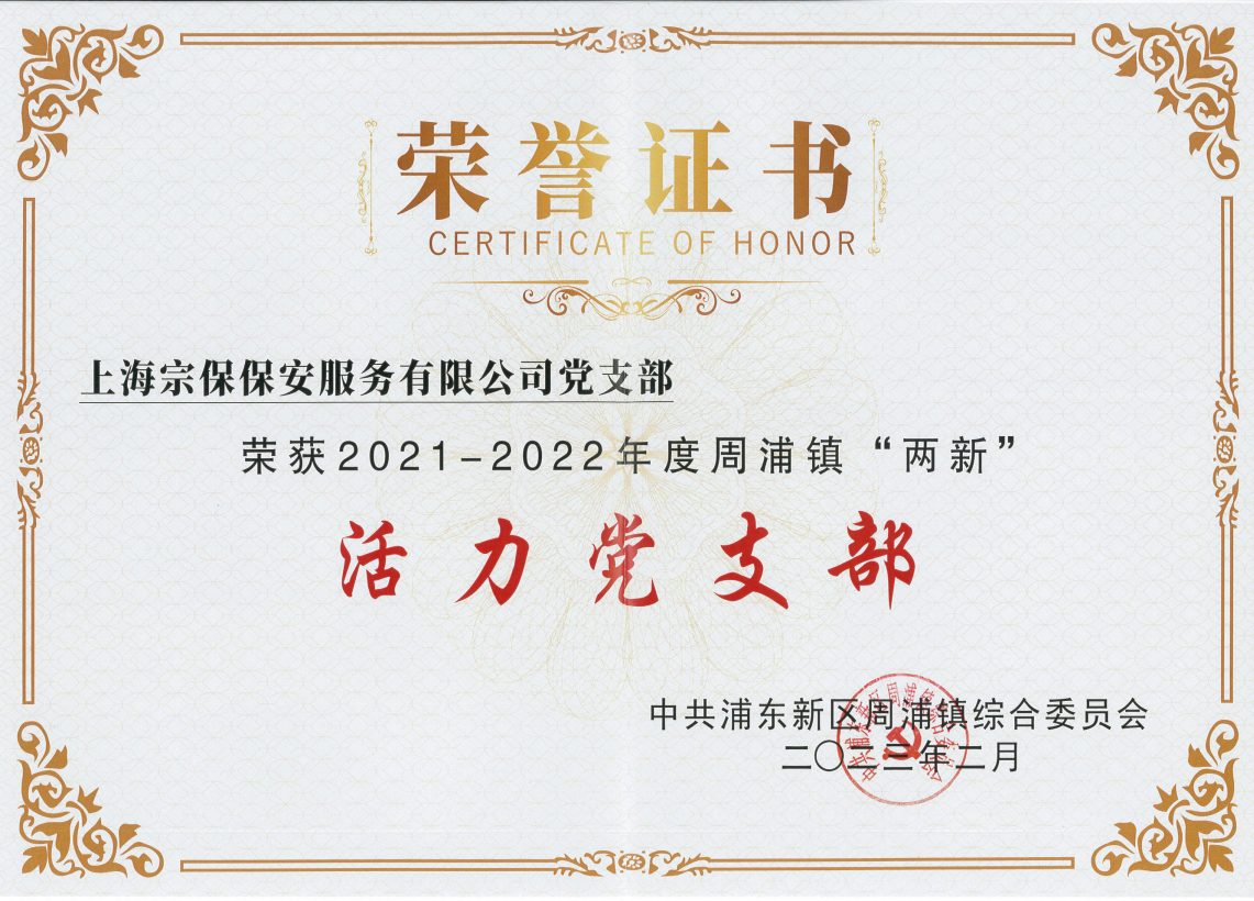 2月15日,浦東新區(qū)周浦鎮(zhèn)黨委對(duì)一批優(yōu)秀強(qiáng)國(guó)學(xué)習(xí)達(dá)人、優(yōu)秀黨務(wù)能手和先進(jìn)基層黨組織進(jìn)行表彰。上海宗保保安服務(wù)有限公司黨支部榮獲2021-2022年度周浦鎮(zhèn)“兩新”活力黨支部榮譽(yù)稱號(hào)。