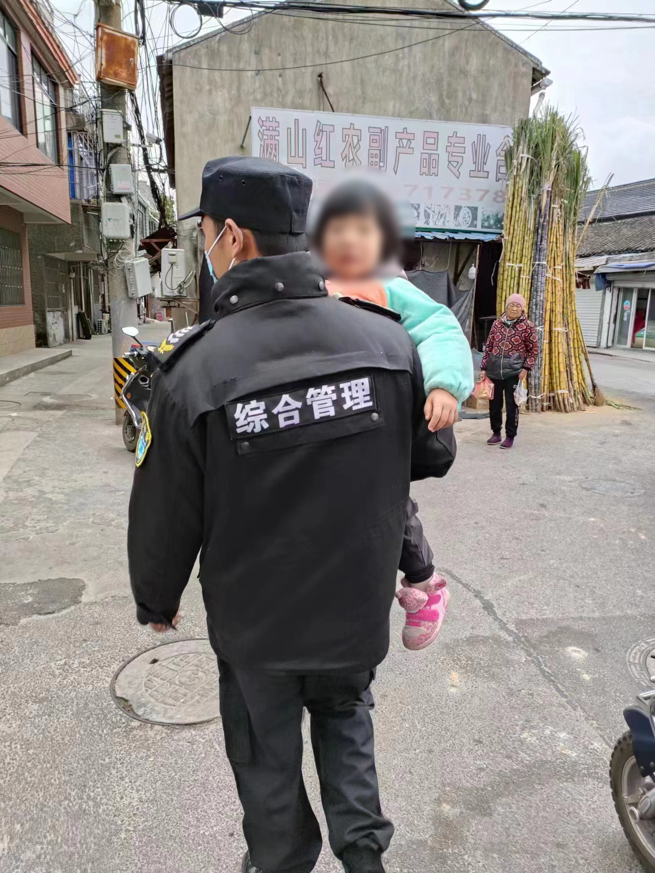 接著,兩人抱著小女孩,沿著街道一邊詢問行走路人,一邊挨家向商鋪店主打聽,看大家有沒有認(rèn)識(shí)這個(gè)小女孩的。功夫不負(fù)有心人。終于遇到一位市民,說小女孩是前面一家店的。