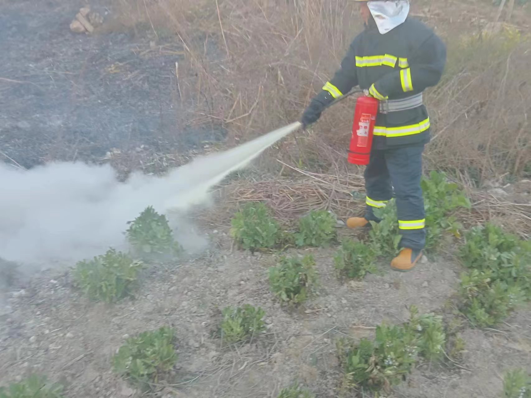 張益佳趕緊將情況報(bào)告項(xiàng)目負(fù)責(zé)人,同時(shí)呼叫微型消防站同事前來支援。接著,張益佳又跑到附近村民家中借來水桶提水。很快,微型消防站的同事趕到事發(fā)現(xiàn)場(chǎng),幾人拿起滅火器合力撲滅了野火。