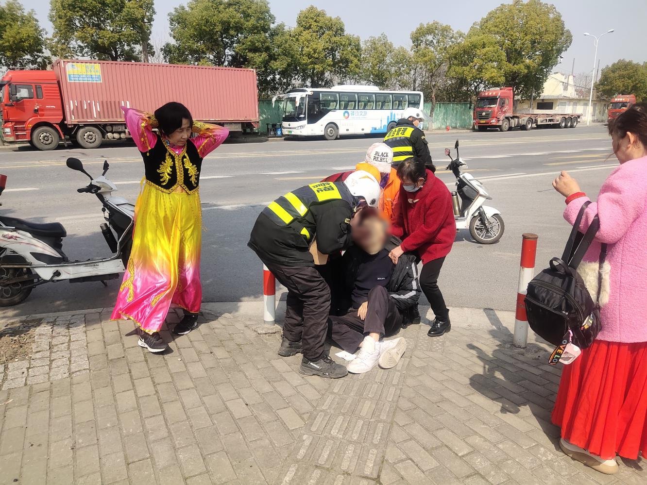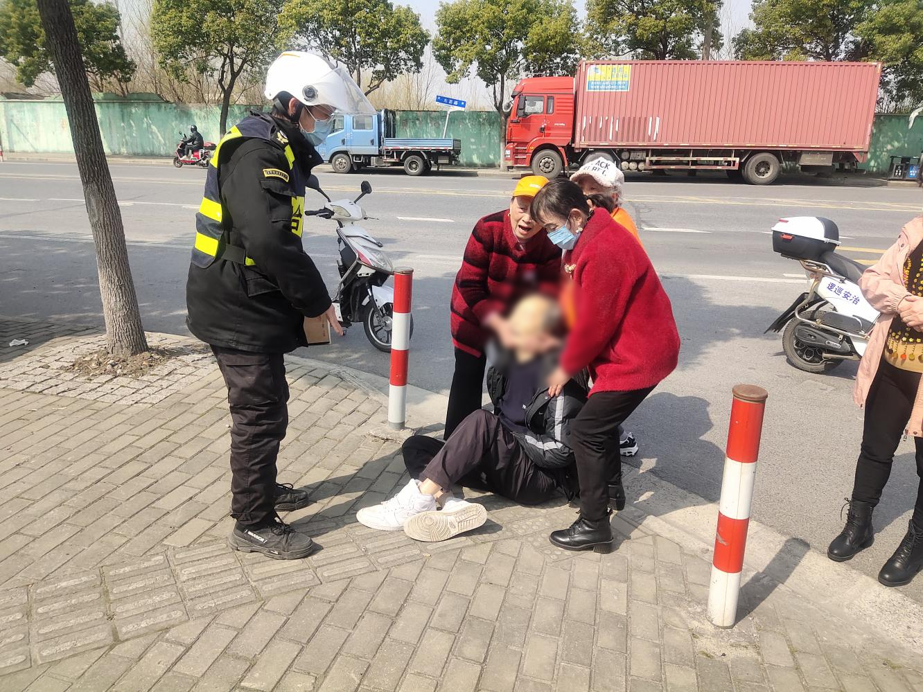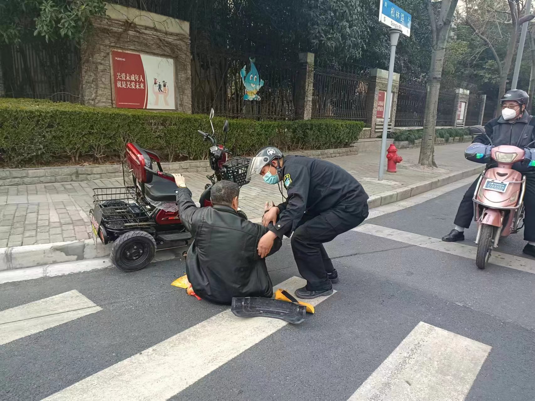 當(dāng)日15:40,公司員工郁海燕和李福豪在商城路松林路路口巡邏時(shí),看到一位老人被一輛老年代步車壓著,躺在地上動(dòng)彈不得,便急忙上前幫助。